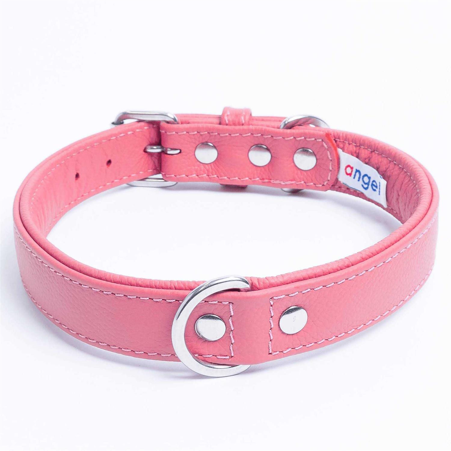 Angel Alpine Plain Dog Collar These solid colored padded collars are available in 7 different colors, for small to XL breeds. Great quality for a great price. The super-soft Australian cowhide is sure to make this the most comfortable collar your dog has ever worn. A solid stainless steel centre D-Ring is present for maximum exposure & versatility.
