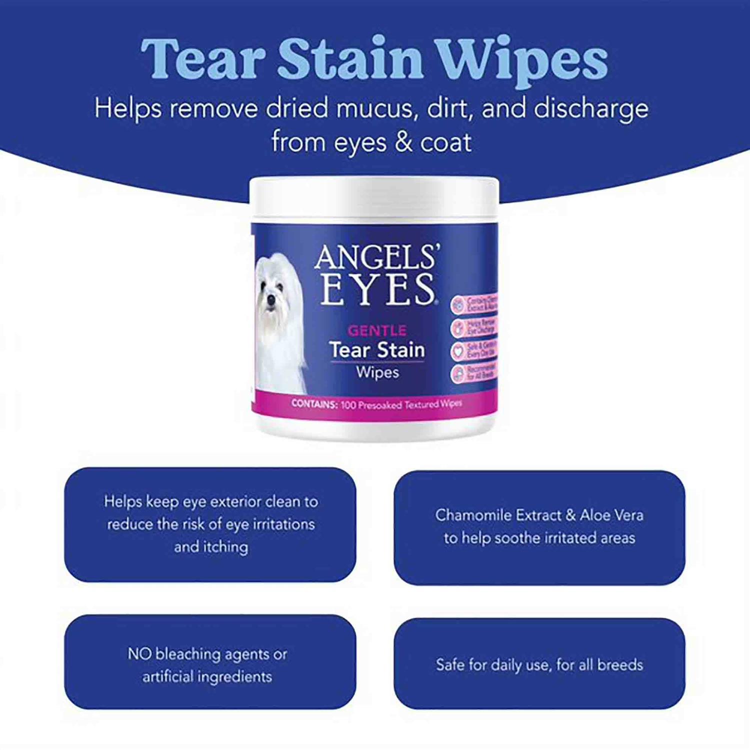 Angels Eyes Gentle Tear Stain wipes are recommended to help remove dried mucus secretions, discharge, and tear stains from around your pet’s eyes. Use daily to keep eye exterior clean and help reduce the risk of eye irritations and itching caused by foreign matter your dog or cat can pick up. Our unique formulation requires no rinsing.
