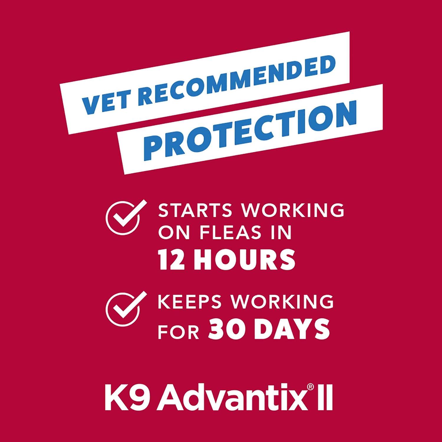 Repels and kills ticks including Deer ticks (vector of Lyme disease), American dog ticks (vector of Rocky Mountain spotted fever), Brown dog ticks (vector of ehrlichiosis), and Lone Star ticks for up to four weeks. Kills 98-100% of the fleas on dogs within 12 hours and continues to prevent infestations for at least four weeks. Kills fleas before they lay eggs. Larval flea stages in the dog’s surroundings are killed following contact with K9 Advantix treated dog. Repels and kills mosquitoes for up to four weeks. Remains effective after bathing and swimming.
