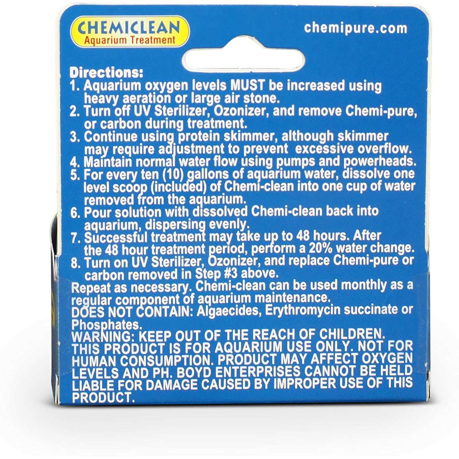 Cynobacteria is usually encouraged with the presence of nitrate and ammonia, which are both fixed forms of nitrogen. Chemiclean helps clean and remove this problem algae through its own unique process. Most other red slime removers use purely antibiotics, namely erythromycin to take care of the algae. The use of such substances with in your aquarium can have disastrous effects upon your nitrifying bacteria and cause your tank to crash, killing the inhabitants of your aquarium.The use of chemi-clean not only as a problem solver, when red slime is present, but as a regular maintenance procedure will help keep your water crystal clear and your tank free of unwanted cynobacteria. For best results, turn off UV sterilizer or Ozonizer and Protein Skimmer. Remove Chemi-Pure or Carbon Filtration for 24 hours following each treatment. It is advisable to do at least a 20% water change after full treatment.You must use an air stone when using Chemiclean. Place airstone in the aquarium prior to and during treatment. Removes disease causing red cyanobacteria (red slime) from live coral. Removes red slime, black, blue-green and bubble producing algae. Oxidizes trapped organic sludge and sediment. Clarifies aquarium water to crystal clear. Promotes ideal enzyme balance. Contains no phosphates, algaecides or erythromycin succinate. Safe for reef tanks, all invertebrates, desirable macro algaes, nitrifying bacteria and fish. Treats up to 720 Gallons.