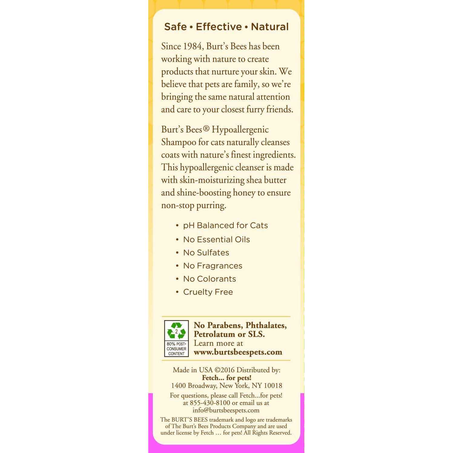 Burt’s Bees Hypoallergenic Cat Shampoo is made with some of nature’s finest ingredients for your peace of mind and a happy cat. Burt’s Bees uses all-natural ingredients because we wanted a powerful but safe way to bathe your cat’s sensitive skin without any harmful chemicals or irritants. Tap into nature’s power with this Hypoallergenic Cat Shampoo made with naturally hypoallergenic shea butter for deep moisturizing and honey to give fur a super shine.