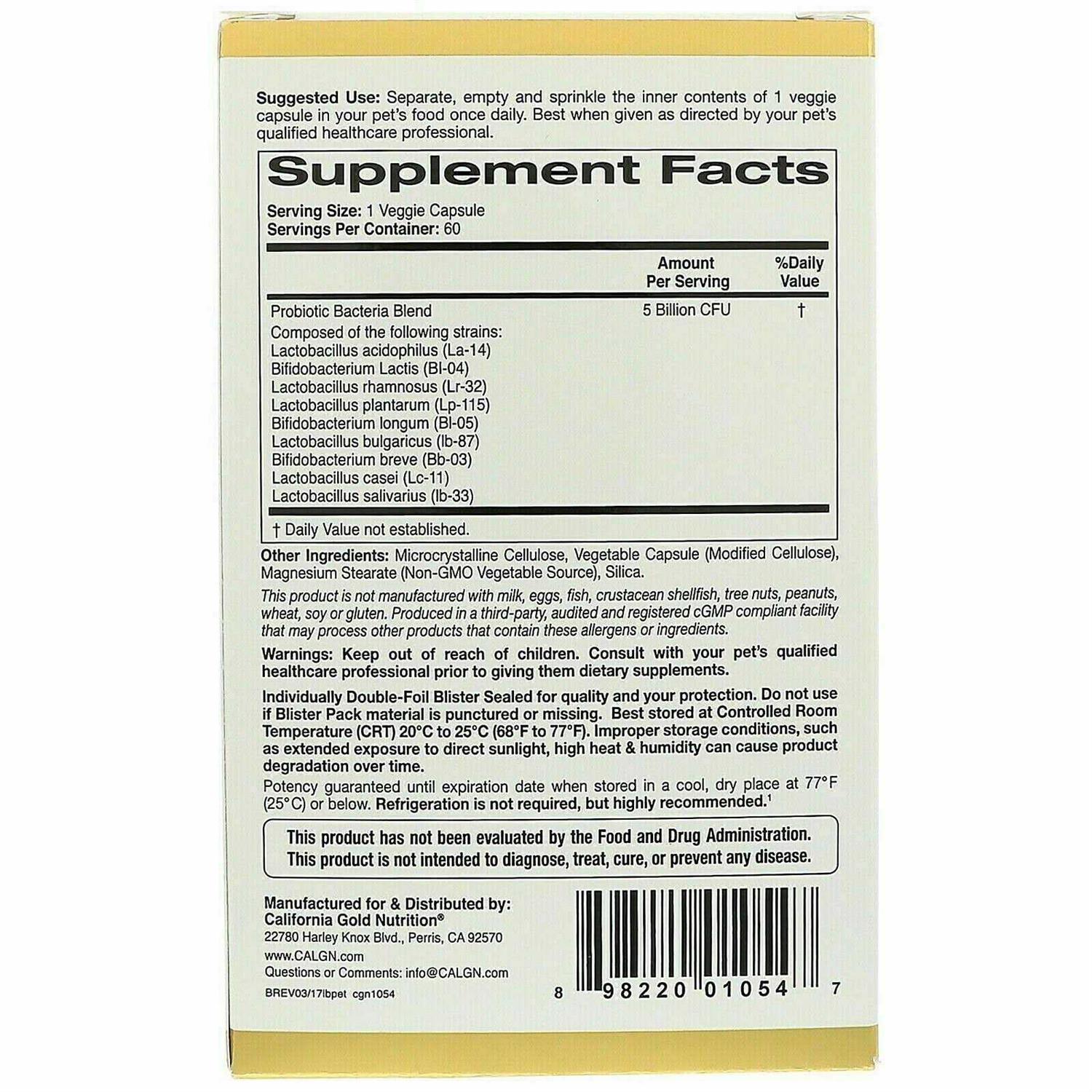 California Gold Nutrition LactoBif Pet Probiotics 5 Billion CFU 60 Veggie
