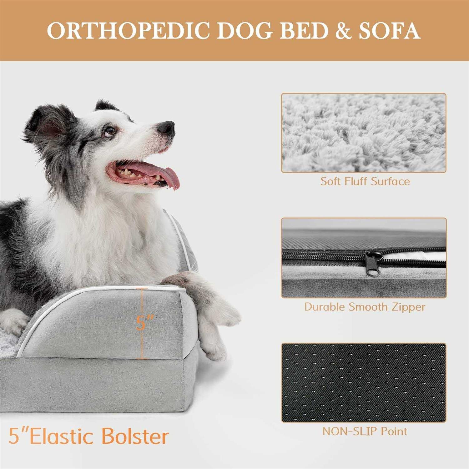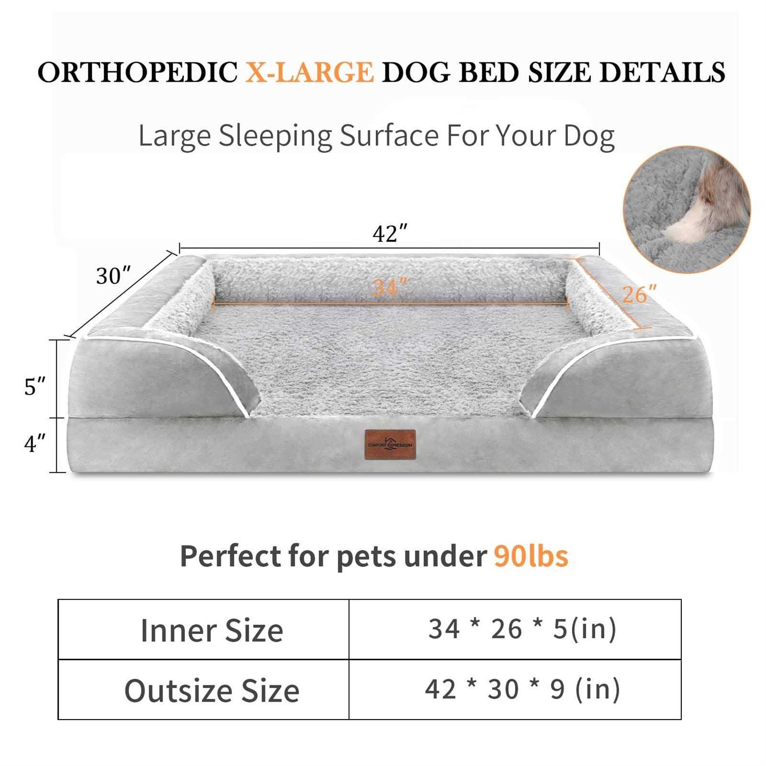 28D EGG CREAT FOAM:4 inch high 28D egg sponge large size dog bed, the sponge is soft and elastic,can evenly support the dog’s joints and muscles, especially suitable for elderly dogs with anxiety and dogs with arthritis. SOFA DOG BED DESIGN: This pet bed large is wrapped with four handrails,The fence-like design makes the dog feels more secure lying in it.And 3.5 inch side pillow provide extra support for your pet’s neck and head, can be relaxed and soothed,so that the pets can rest better in the dog beds. EASY TO CLEAN & MAINTAIN:1Double-layer zipper design: Zip the zipper of the armrest and the bottom zipper to easily take out all sponges. You just need to clean the dog bed cover to keep the elasticity and use time of the sponge 2Pet bed large size Dog Bed Removable cover is machine washable,just remove the dog bed cover and throw it into the washing machine3Do not immerse in water for long time,suitable for low-temperature drying. SOFT SURFACE:The surface is made of high-quality plush, which is comfortable to the touch and does not pill or fade.The materials are gentle on skin,noses and paws. WATERPROOF LAYER:Don’t worry about getting the memory foam dog bed wet, the washable dog bed cover has a waterproof lining on the back to prevent liquid leakage and protect the foam. Removable cover with zipper support machine washing and low-temperature drying. SIZE RECOMMENDATION: Sleep area of large dog bed is 22 × 22 inches, The classic bolstered xlarge dog bed provids high-loft orthopedic cushion support as well as a super cozy nestling and burrowing space for dogs and cats.This dog bed large size dog suitable for dogs weighing under 50 pounds. If your pet’s weight and lying length just fit one size or between two sizes, it is recommended to choose a larger size for the comfort of the dog. dog beds for large dogs