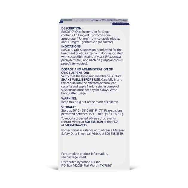 Easotic is an effective antibiotic treatment for dogs suffering from otitis externa, an ear infection usually caused by yeast or bacteria. This medication is supplied in a convenient one-pump form that is usually given just once a day for five days.