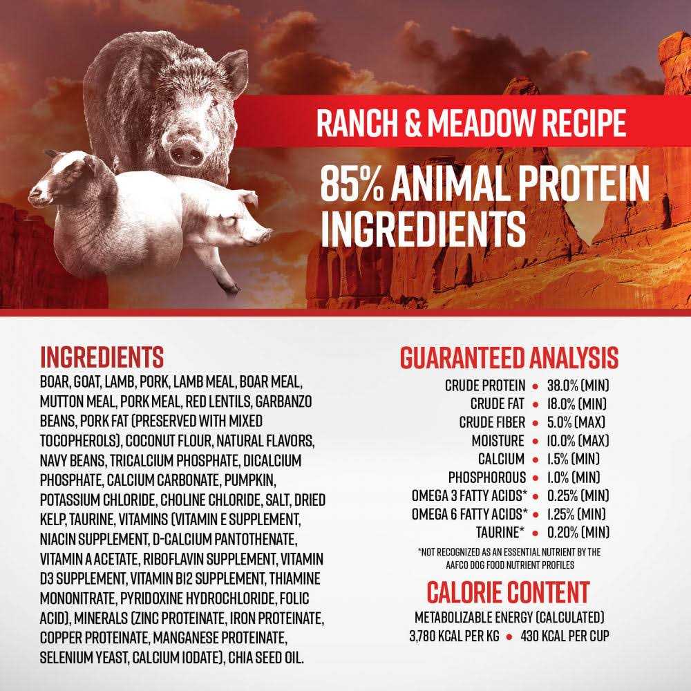 Essence Ranch & Meadow Recipe is loaded powerful protein that only red meat can provide. Our first four ingredients are boar, goat, lamb, and pork. The recipe is completely grain free, and that promotes a clean, hypoallergenic, diet. It is also backed up with healthy vegetables, such as pumpkin, which provide additional healthy nutrients and dietary fiber. This is all to ensure your dogs are at their healthy best, while eating truly great tasting food. Made with healthy and wholesome ingredients, the Essence? Ranch & Meadow Recipe is truly the Embodiment of Superior Nutrition.
