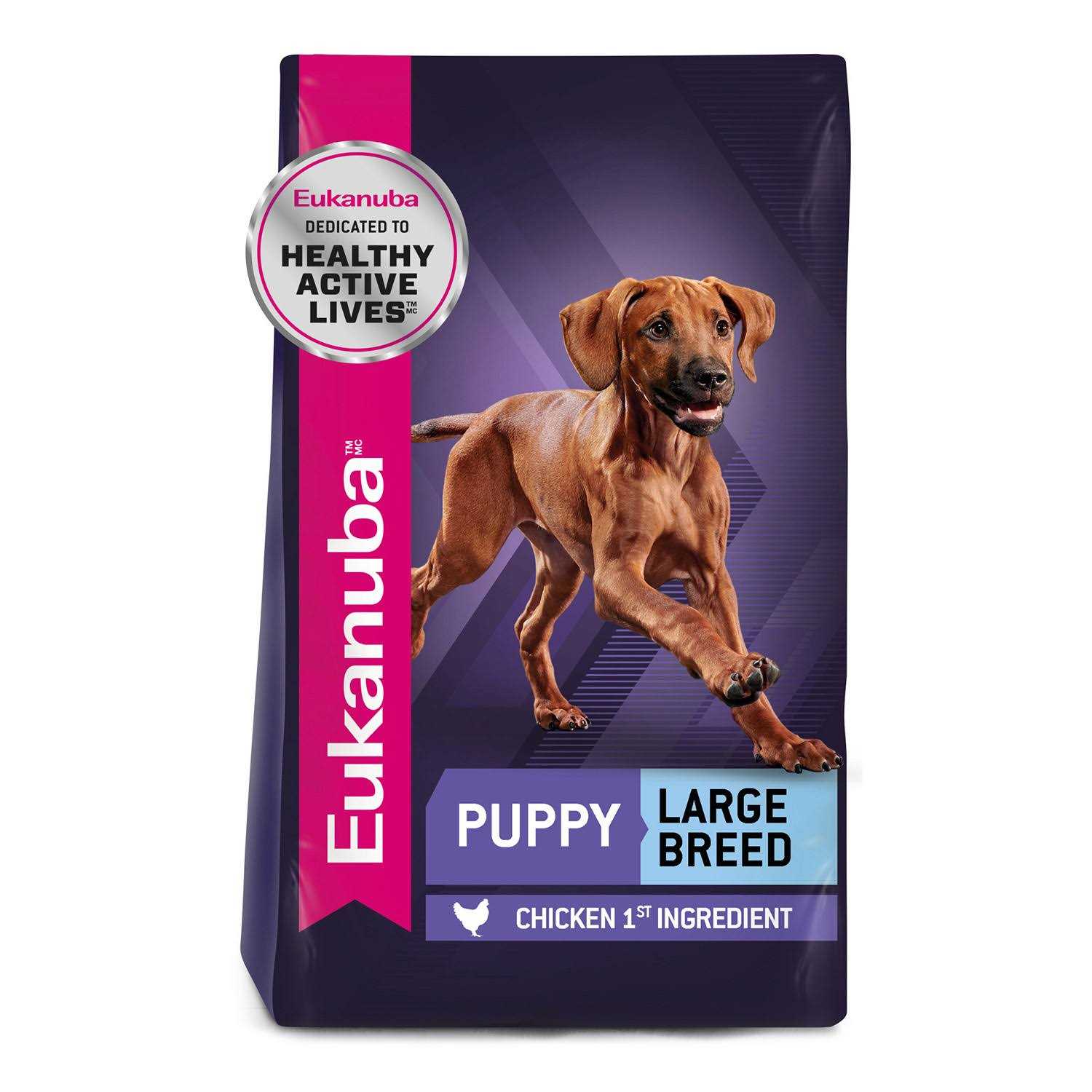 Eukanuba Large Breed Puppy Food is complete and balanced nutrition for large breed puppies up to 15 months old with an expected adult weight over 55 lbs. With their endless energy, determination, and smarts, it’s clear your large breed puppy is anything but ordinary. Unleash their extraordinary potential with Eukanuba Puppy Large Breed dry dog food. This complete and balanced puppy food is made to fuel your growing companion’s body, mind, and energy. Features: High-quality animal proteins and optimal levels of calcium and phosphorus help maintain muscle growth and bone health. Clinically proven DHA levels promote healthy brain development for a smarter, more trainable pup. Optimized fat and carbohydrate levels give your puppy concentrated energy for growth and play. A natural fiber and prebiotic blend aids gentle digestion. Guaranteed levels of the antioxidant vitamin E help support your little champion’s developing immune system. High-quality chicken is the first ingredient to power your big dog’s day.