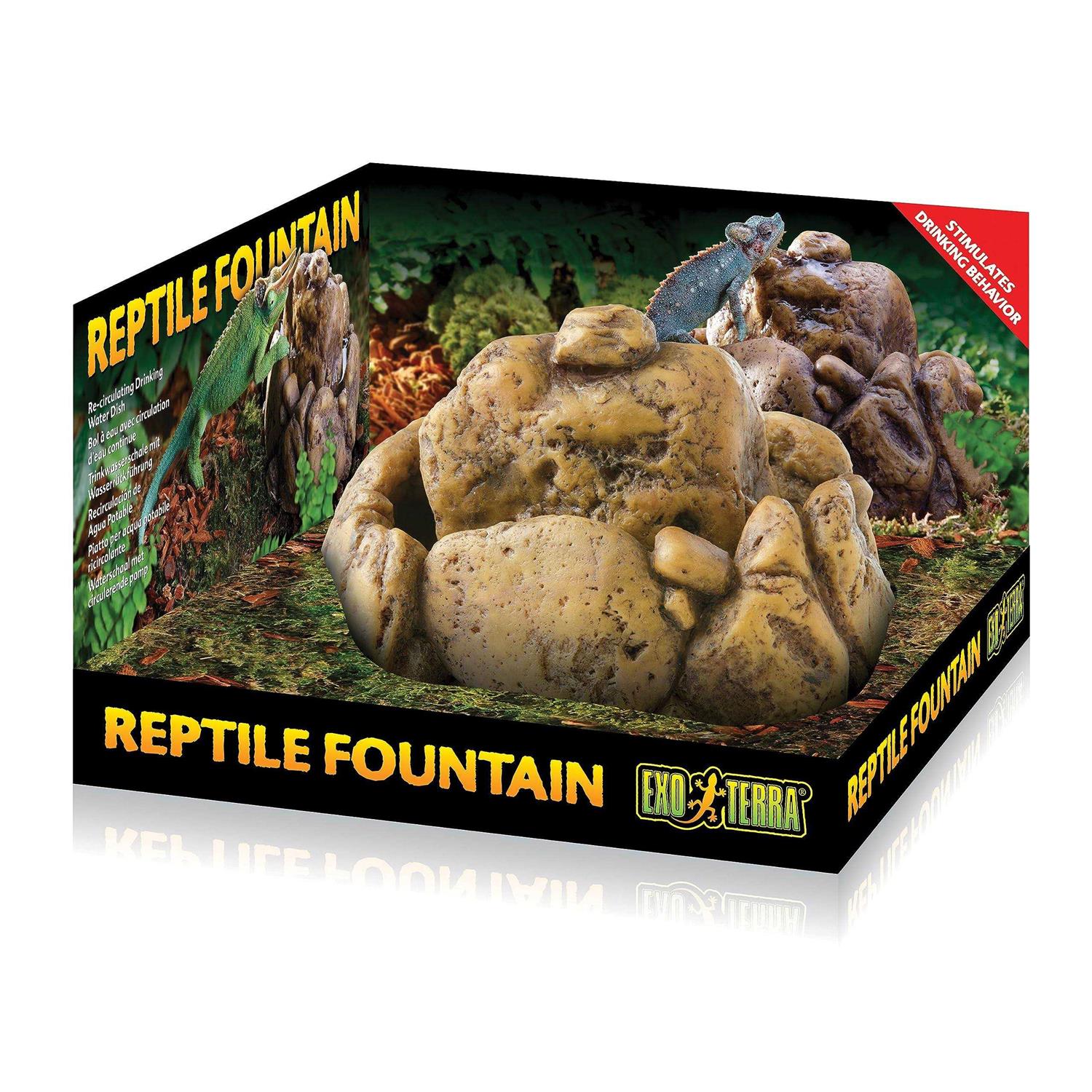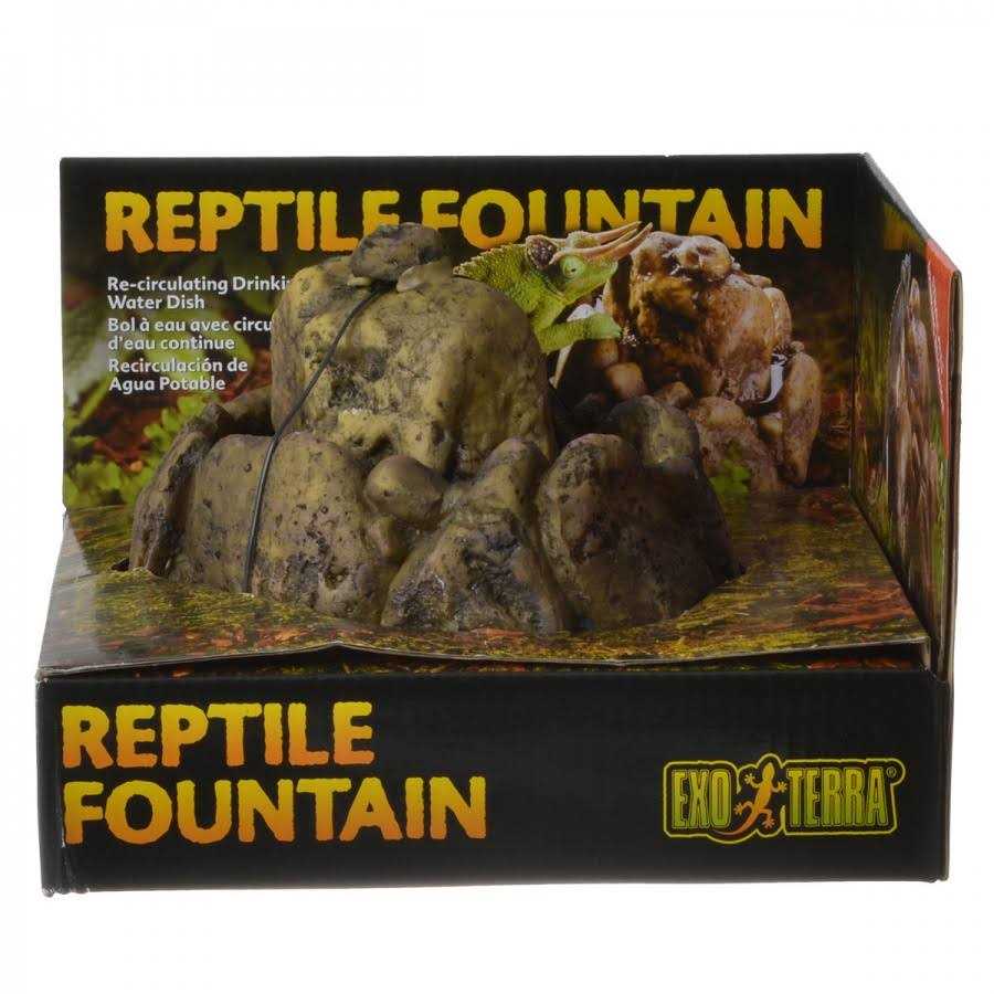 Continuous supply of fresh and clean drinking water Increases humidity levels Stimulates drinking behavior of reptiles Designed for easy storage Designed to be easy to use The Exo Terra Reptile Fountain is a unique water dish that supplies your reptiles and amphibians with a continuous supply of fresh, clean, aerated drinking water. Many reptiles do not recognise stagnant water as a source of drinking water. The Reptile Fountain’s constant movement of water tumbling down from the rock, encourages reptiles to drink more, keeping them healthy and hydrated. The continuously flowing water raises humidity levels in the terrarium. The stable and compact design make it easy to install and difficult to tip over. The Exo Terra Reptile Fountain is easy-to-maintain, as it consists of only two pieces that can easily be dismantled for cleaning purposes. An Exo Terra Repti Flo pump is included to provide water circulation. As a safety measure, for smaller species, small stones or gravel may be added. Tap water should be treated with Aquatize to remove chlorine and heavy metals. Adding Biotize will help to keep the water cleaner longer, as well as promoting necessary beneficial bacteria and reducing odors associated with decaying waste.