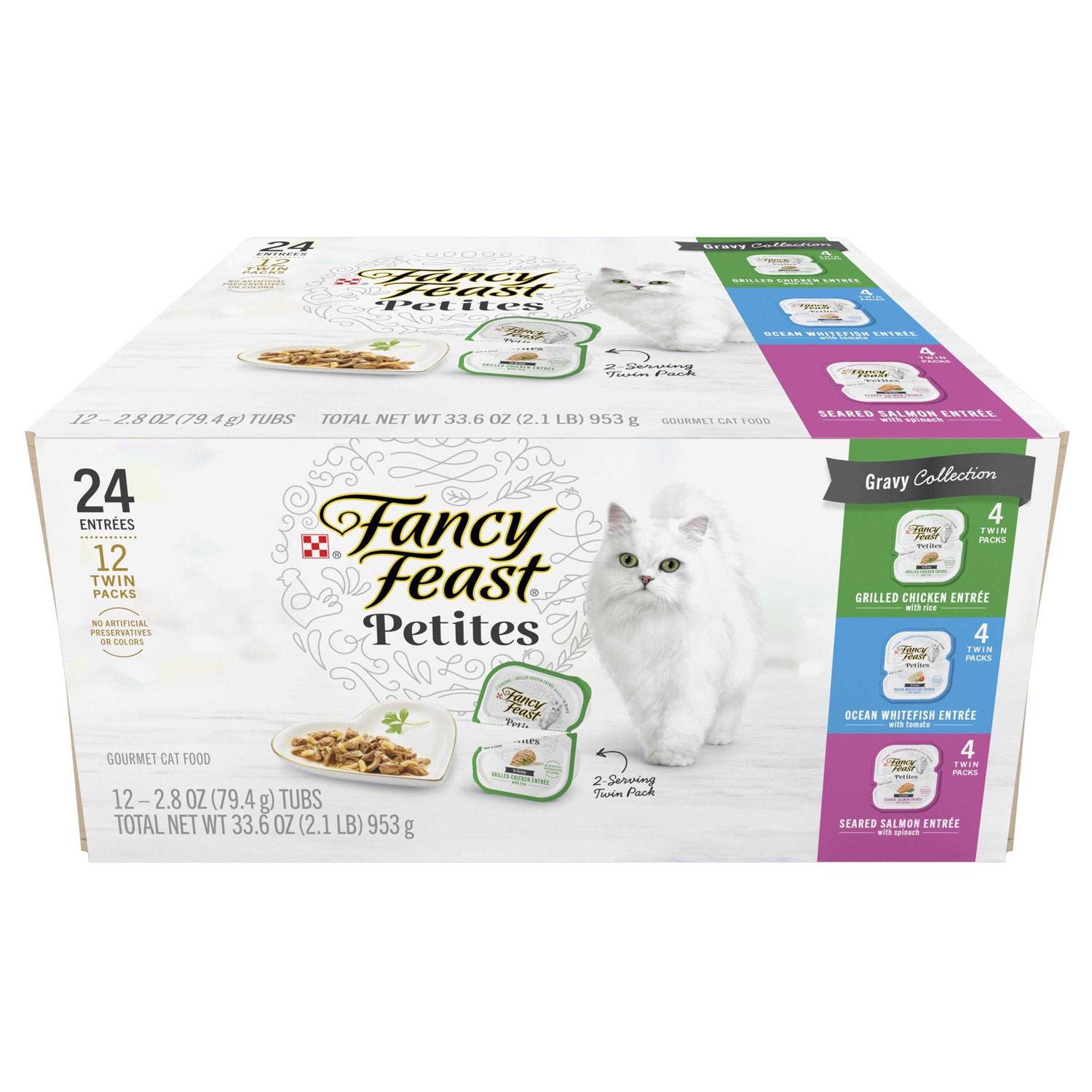 Bring on the gourmet goodness for your cat with the sophisticated entrees in the Purina Fancy Feast Petites Gourmet Gravy Collection Variety Pack Wet Cat Food. Each yummy recipe comes in convenient, single serving cat food trays that leave no mess and no leftovers. Just snap the break-apart tray in half, peel back the top and serve! Your kitty is sure to love the irresistible flavors in this wet cat food variety pack, which includes Ocean Whitefish Entree With Tomato in Gravy, Seared Salmon Entree with Spinach and Grilled Chicken Entree With Rice in Gravy. Each gourmet cat food with gravy recipe is made with real poultry or fish and no artificial preservatives or colors for meals you can both feel good about. You get easy, hassle-free feeding, and she gets the high-society flavor she loves plus complete and balanced nutrition for the maintenance of adult cats.