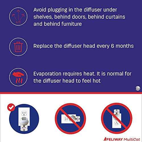 Are your cats fighting, or is there tension between cats in your household? FELIWAY MultiCat is vet recommended, drug free, and clinically proven reduce tension and fighting among cats in the home. Signs of tension could include chasing, blocking, staring, fighting, or hissing among cats. By mimicking the natural feline appeasing messages (pheromones), FELIWAY MultiCat sends “harmony messages” to help your cats get along more effectively, and avoid tension, conflict and fighting in the home. Most cat owners see a 70% reduction in conflict in 3 weeks. The FELIWAY MultiCat Refill includes six refill vials (diffuser head not included). You should plug your diffuser in the room(s) where your cat spends the most time, and make sure it isn’t covered by curtains, or behind furntiure. Each diffuser covers up to 700 sq. feet, and each refill can last up to 30 days. For maximum effectiveness, you should replace refills every 4 weeks, and your diffuser every 6 months. Make sure to follow the instructions when plugging in your diffuser, and plug the diffuser in upright.