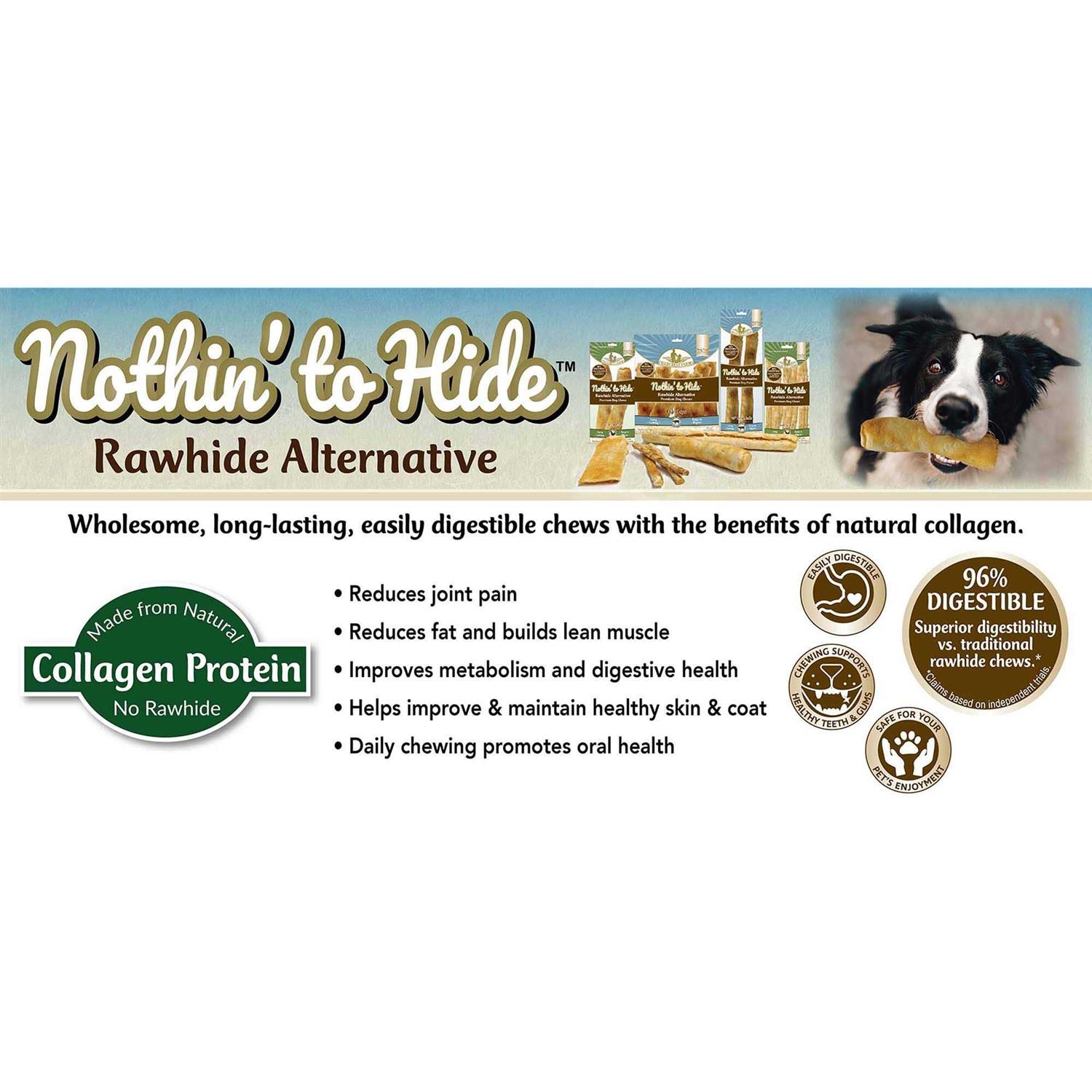 Nothin’ to Hide chews are highly digestible alternative to rawhide. Available in a wide range of sizes and shapes, the wholesome chicken coated chews are sure to offer a safe, flavorful chewing experience for the pets. Wholesome chicken flavored rawhide alternative provides a long lasting, highly digestible chew for the pet. Easily Digestible for safe and reliable enjoyment. Chewing helps satisfy pets natural desire to chew. Chewing also promotes strong teeth and healthy gums. Size: 240 G 8pcs per pack Caution Statement: Please supervise the pet while giving any treat or chew. Please dispose of properly if any small pieces or sharp edges are present. Provide clean drinking water at all times. Not for human consumption.