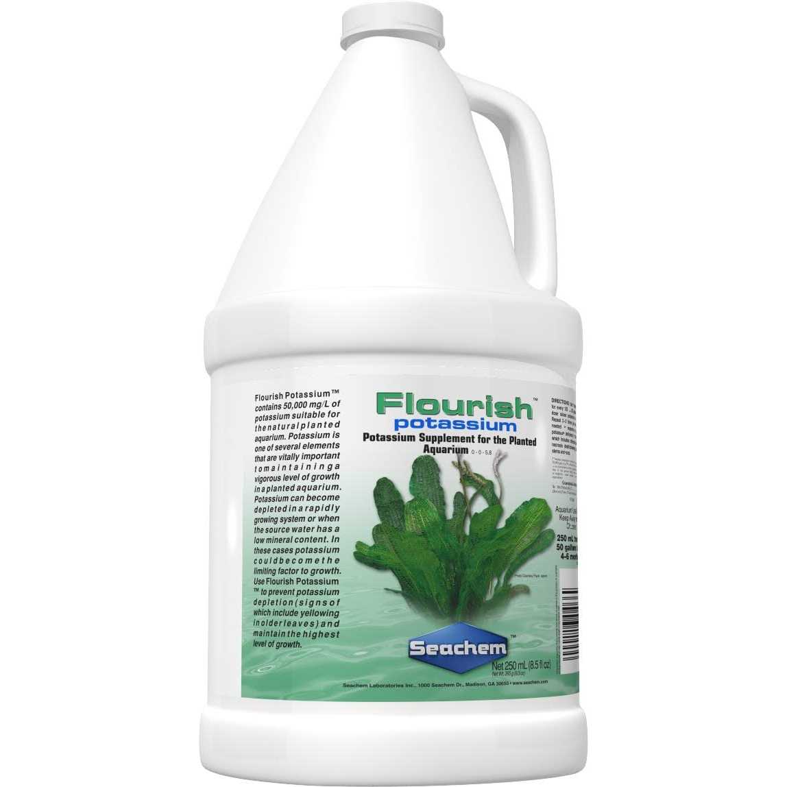 Flourish Potassium contains 50,000 mg/L of potassium suitable for the natural planted aquarium. Potassium is one of several elements that are vitally important to maintaining a vigorous level of growth in a planted aquarium. Potassium can become depleted in a rapidly growing system or when the source water has a low mineral content. In these cases potassium could become the limiting factor to growth. Use Flourish Potassium to prevent potassium depletion (signs of which include yellowing in older leaves) and maintain the highest level of growth. Use 1 capful (5 mL) for every 125 L (30 gallons*). This dose raises potassium by 2 mg/L. Repeat 2–3 times per week or as needed (in response to signs of potassium deficiency in older leaves which includes: chlorosis (yellowing), necrosis (death/browning), and weak stems and roots.
