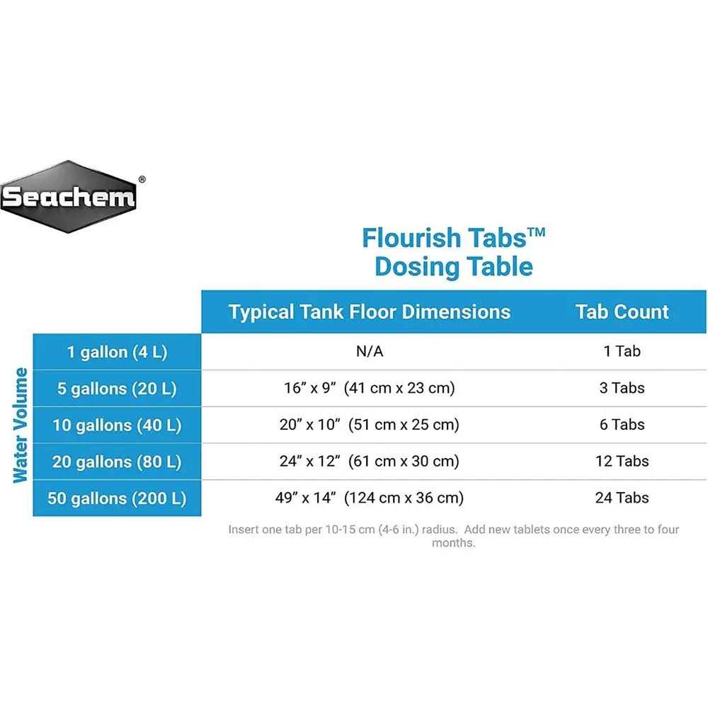 Seachem Flourish Tablets are rich in essential trace elements, amino acids, vitamins, and minerals to stimulate healthy growth in aquatic plant roots. They contain no phosphate or nitrate and do not support the growth of nuisance algae. Gravel bed supplement for the planted aquarium Growth stimulating tablets for plant roots Source of micro elements, trace elements and other essential nutrients These convenient tabs are rich in iron, manganese, magnesium, calcium, potassium, inositol, choline B12, biotin, and other factors that are beneficial for aquatic plant roots. They’re an ideal aid for the beginner, with all the nutrients found in Seachem Flourish compressed into an easy-to-use, pre-dosed tablet. Once inserted into the gravel, Flourish Tabs provide direct, time-released fertilization to the root zone. Roots then perform enzymatic action on the tabs, slowly releasing nutrients in healthy doses. Ten tablets will treat a 12×30 plant bed twice. For best results, use in combination with Flourish.Directions: Insert one Flourish Tab in the gravel for every 10-15 cm (4-6) radius. A standard 10 gallon aquarium requires 6 tabs. Distribute the tablets evenly throughout the gravel bed. Add new tablets once every 1-3 months for optimal plant growth. Tabs will not alter pH, but, in very soft or unbuffered water, they have slightly acidic properties similar to peat moss.Guaranteed Analysis:Total Nitrogen – 0.28%Available Phosphate – 0.17%Soluble Potash – 0.16%Calcium – 14.9%Magnesium – 0.06%Sulfur – 12.2%Boron – 0.029%Chlorine – 0.55%Cobalt – 0.001%Copper – 0.001%Iron – 2.2%Manganese – 0.23%Molybdenum – 0.0009%Sodium – 0.14%Zinc – 0.0024%