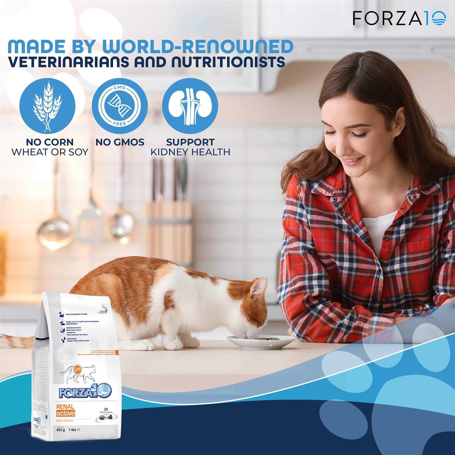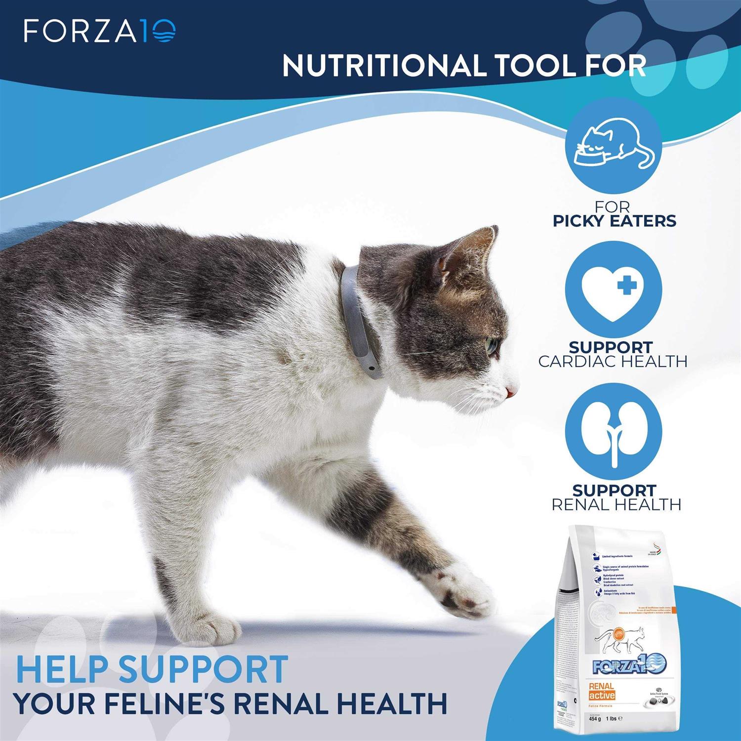 KIDNEY CARE CAT FOOD – this dry kidney cat food is formulated to help improve poor kidney function and heart issues. Made with anchovies, salmon and therapeutic plants to provide beneficial nutrients to support your cats health VET RECOMMENDED RENAL CAT FOOD – keeps cats well-nourished by providing the holistic nutrition they need. Great tasting renal dry cat food that does not require prescription LOW PROTEIN, LOW SODIUM, LOW PHOSPHORUS CAT FOOD – kidney diet cat food helps cats with chronic renal insufficiency. Great cat food for kidney disease so that your feline companion feels better PREMIUM QUALITY HEALTHY CAT FOOD KIDNEY DIET – corn, wheat and soy free, no antibiotics, NON-GMOs, no artificial preservatives or flavors. Made with hydrolyzed fish protein for easy digestion and cat kidney support CAT RENAL FOOD – made from natural ingredients with an optimal balance of Omega 3 and 6 fatty acids. Kidney diet for cats that delivers fast results. Kidney formula cat food available in 1, 2 and 4 pound bags FORZA10 KIDNEY RENAL ACTIVE /b represents the specific Active Line diet developed to help all cats with chronic or acute kidney problems or heart problems which don’t respond satisfactorily to conventional therapy. br br Renal Active has been developed to support renal and cardiac metabolism in all cases of chronic renal failure, acute renal failure, congestive heart failure, conditions requiring low protein diets, conditions requiring low phosphorus and or sodium content diets. br br The effectiveness of Active Line diets is supported by numerous scientific studies conducted in association with Veterinarians and Italian Universities and published in prestigious international scientific journals Features. ul li KIDNEY FAILURE CAT FOOD – this dry cat food is specifically formulated to help improve poor kidney function and heart issues /li li LIMITED INGREDIENT CAT FOOD – keeps kidney kitties and cardiac cats well-nourished by providing the holistic nutrition they need /li li LOW PROTEIN, LOW PHOSPHOROUS AND LOW SODIUM DIET – dry cat food recipe designed for cats with renal issues /li li HIGH QUALITY HEALTHY CAT FOOD – corn free, wheat free, soy free, by-products free, harmful antibiotics free, NON-GMOs, no artificial preservatives, colors or flavors /li li MADE IN ITALY – made from quality and fresh ingredients while containing an optimal balance of Omega-3 and -6 fatty acids /li /ul