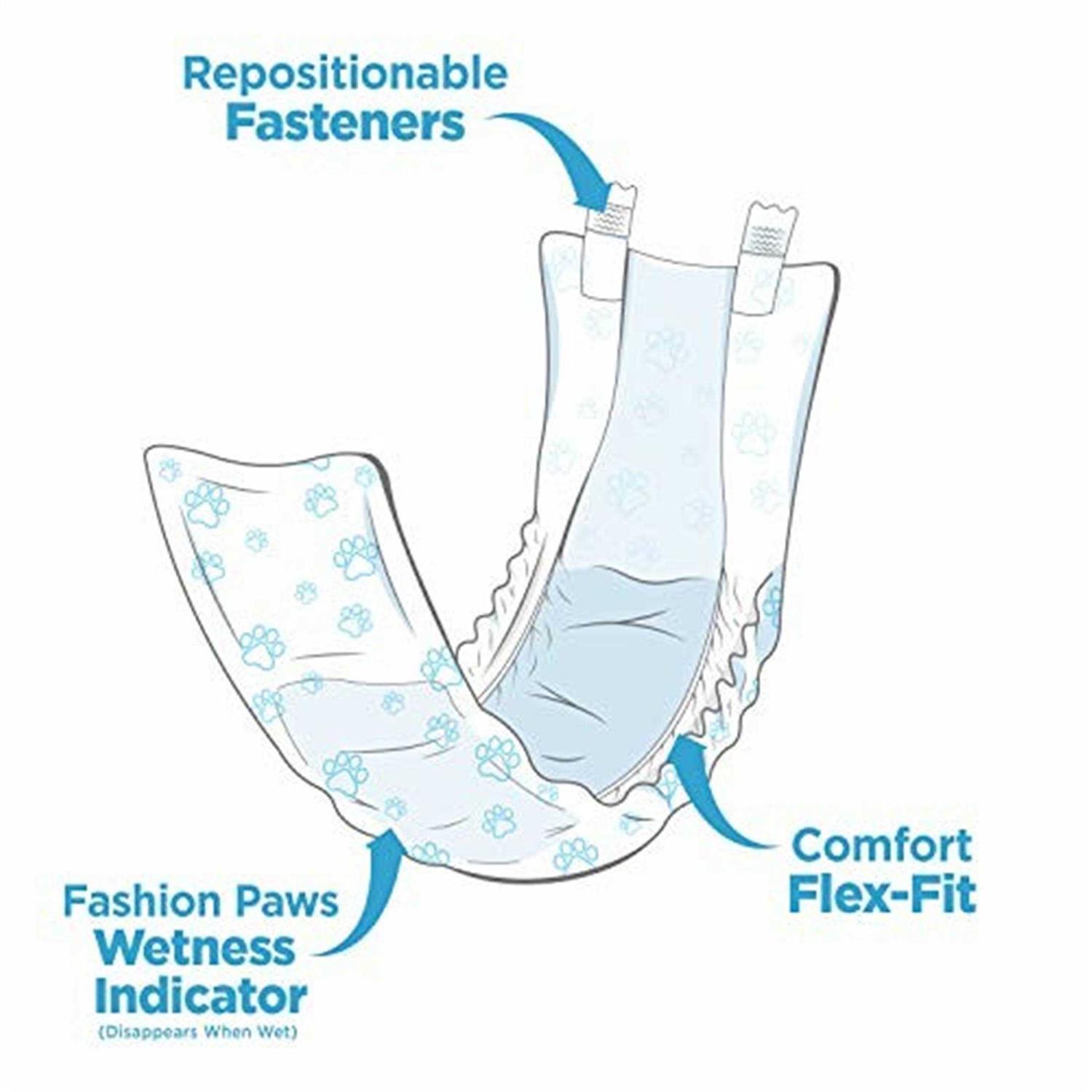 Wee-Wee Disposable Male Wraps are a clean and easy solution for solving male marking, incontinence, excitable urination, and more! Featuring Super-Absorbent Smart 6-Layer Technology, these dog male wraps have a soft and breathable rapid-dry liner that keeps your furry friend clean and comfortable throughout the day. In the middle, the Quick-Dry Leak Guard Core is made of multiple layers and quickly turns liquid into gel. The final layer locks away moisture to prevent leaks and is guaranteed to provide 12 hours of protection! Designed with ultimate comfort and protection in mind, these wraps for male dogs include double-stitched elastic to ensure a snug and flexible fit around your dog’s waist. Fur-friendly fasteners allow you to readjust the wrap as needed without irritating your dog’s coat. To let you know when it’s time for a new wrap, the Fashion Paws Wetness Indicator blue pawprint pattern will fade when wet. Great for puppy training, traveling, or any other instance of unexpected urination, each absorbent male dog wrap will keep your dog dry and your home clean!