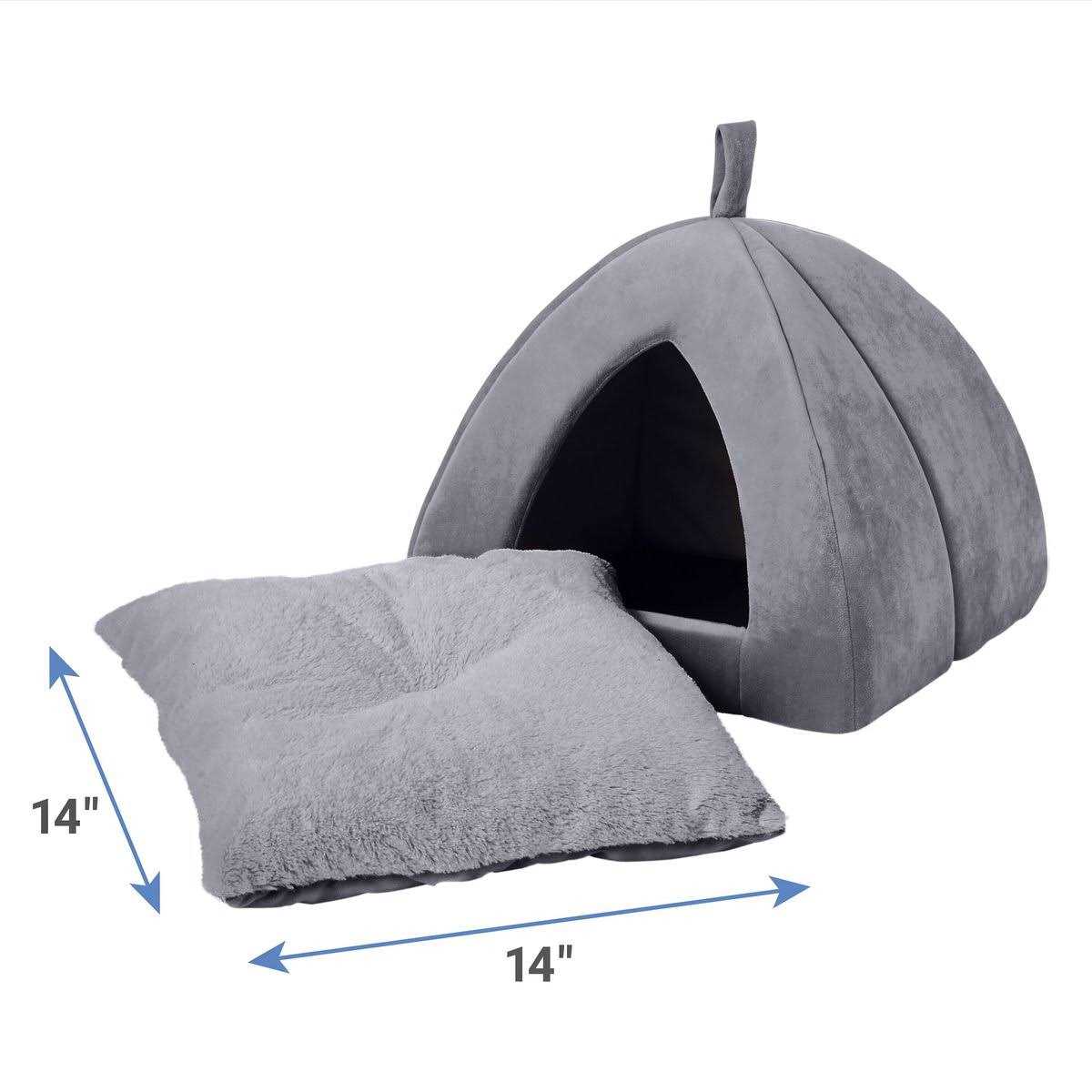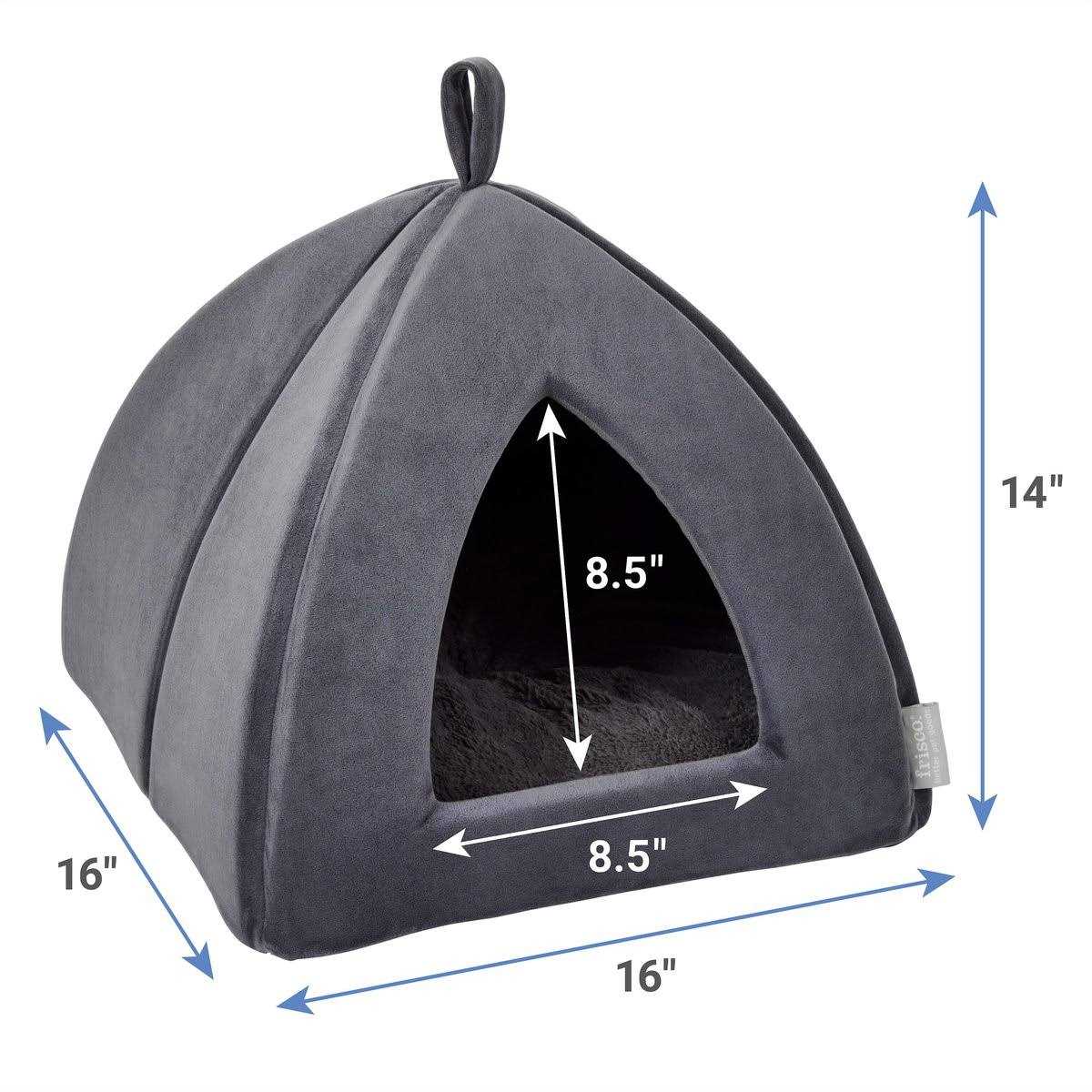 Give your pet a cozy spot to rest their paws with the Frisco Tent Covered Dog & Cat Bed. The super-soft plush fabric and enclosed tent shape make this pet bed the perfect hideaway. Puppies will enjoy having a den-like home to curl up in, and kitties can settle in for quiet naps. With a removable cushioned pillow, this tent bed is a comfortable retreat that you can set up at home or take along with you on trips. The pillow is machine washable for easy cleaning, and comes in a natural gray color that will blend in with your home décor. This bed is available in two sizes to fit puppies and cats of all sizes.