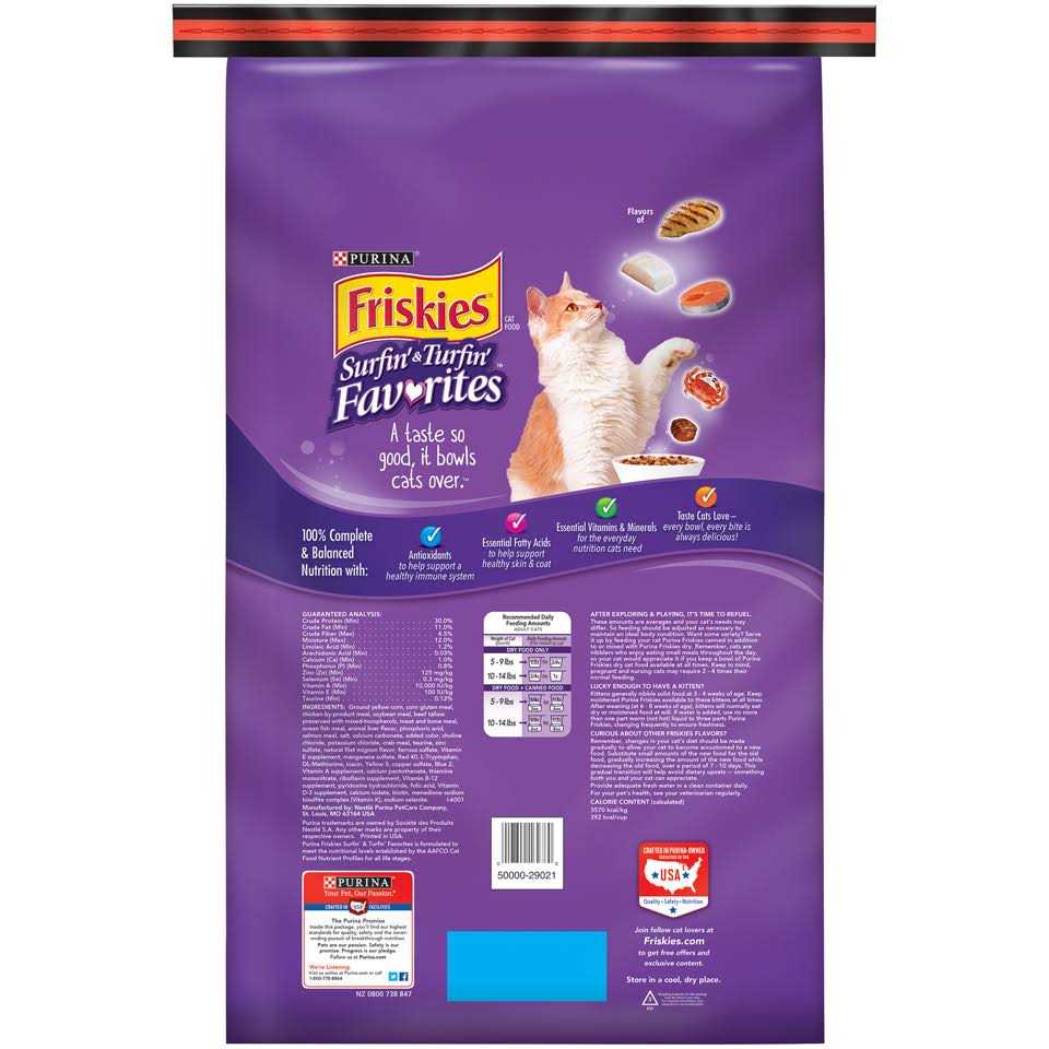Give your cat a delectable flavor combination with Purina Friskies Surfin’ & Turfin’ Favorites dry cat food. Chicken, filet mignon, ocean whitefish, liver and salmon flavors deliver all her favorite tastes in one sensational serving, and the appealing shapes keep her excited about the foods you put in her dish. She’ll love the enticing aroma, which lets her know something delicious awaits her, and you can feel good about the essential vitamins and minerals found in this tasty dry cat food. Featuring a formula that’s complete and balanced for all life stages, this tempting recipe can follow her from her cuddly kitten days to her playful adult years for yummy consistency in her daily diet. You know what a quality product and true value are. Ordering Purina Friskies Surfin’ & Turfin’ Favorites dry cat food combines the two, for more quality time with your feline friend. Offer her this Purina Friskies dry cat food daily, and watch her gleefully nibble away to the bottom of her dish.