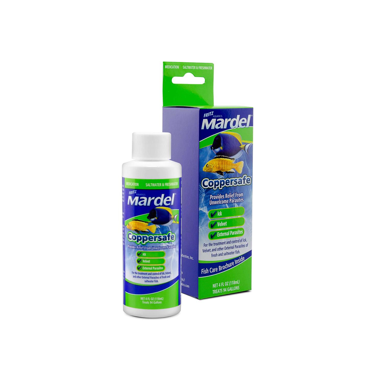 For infections of: Ich, Flukes (Gyrodactylus), Anchor worms, Velvet/Protozoan diseases and other external parasites. Ichthyophthirius (Ich) – White spot disease is caused by a parasite that attacks all freshwater and saltwater fish species. The fish appears to be covered by numerous white spots. The parasite is easily transmitted from one fish to another. Ich can only be controlled in the free-swimming stage of the parasite. Five to 30 days may be needed before the infestation is completely eradicated. Coppersafe solution remains active for over one month in the aquarium. It is a safe, stable, non-staining concentrate that does not color aquarium water. Be sure to add Coppersafe solution to replacement water when water changes are made. This will maintain the therapeutic level of Coppersafe solution. Because Coppersafe solution is so stable in water, partial water changes are the quickest way to remove it from the water.