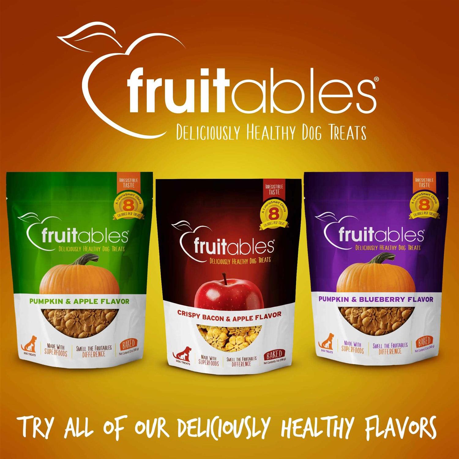 A treat your dog will go ape over! Using harvest fresh Pumpkin as the #1 ingredient creates a unique sensory experience for you and your pet. Since Pumpkin is classified as a fruit in botanical terms and a vegetable in culinary terms, these treats naturally became Fruitables! Delight your loveable dogs with the amazing aromas, irresistible tastes and satisfying crunch of these unique, all-natural, bite-sized treats. Theyre also free of corn, wheat, soy and artificial colors, ingredients or preservatives. Imagine using the finest ingredients in your pantry to create a kitchen filling, delicious muffin aroma that tastes as great as it smells! Fruitables takes the same approach to baking our treats, making it easy for you to indulge and enjoy giving to your pet. Rich in antioxidants, high in fiber and with under 9 calories per treat, Fruitables are also a sensible way to treat/reward your pet and avoid excessive hidden calories that often lead to pet obesity. Available in recyclable 7 oz pouches containing about 90 treats each. Suitable for dogs of all sizes; plus many pet owners have written to tell us their horses, rabbits, guinea pigs, hamsters, pet rats, birds and some cats absolutely crave Fruitables! Intended for supplemental feeding only, feed up to 4 treats per day for every 10 pounds your dog weighs.