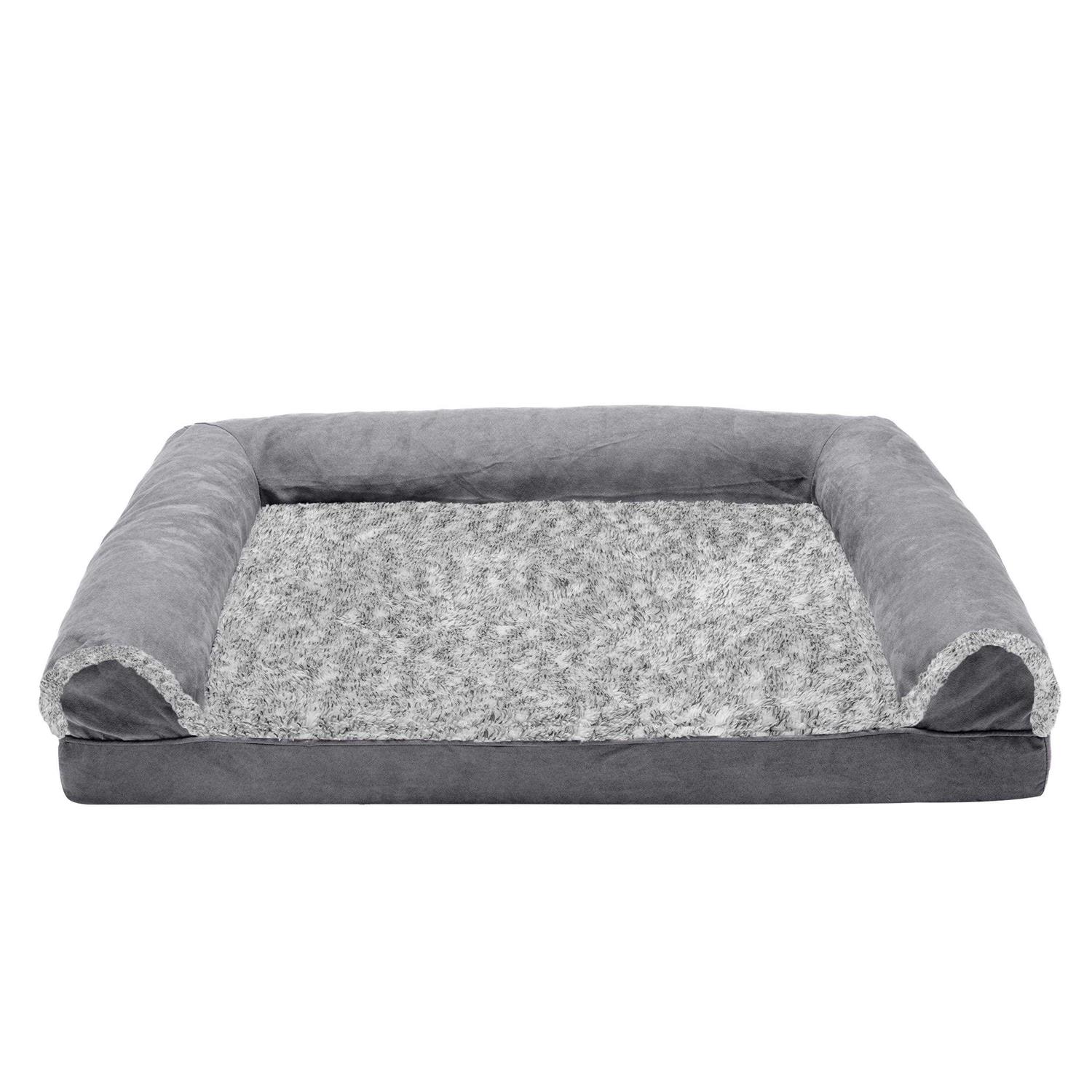 Perfect for pets young and old, the furhaven two-tone faux fur & suede sofa-style orthopedic pet bed is designed to provide your loved one with maximum comfort for a good night’s rest. With a soft, plush faux fur sleeping surface your dog will be more snug than a bug in a rug! Ultra plush, flecked faux fur provides a snuggly soft sleep surface and trims the edges of the bolster for a chic flair. The two-tone design hides dirt and pet dander better than traditional plush sleep surfaces. The orthopedic foam base supports your pet’s joints and pressure points making this pet bed ideal for arthritic pets who have trouble getting comfortable. Give your companion the luxury they deserve with this orthopedic dog bed. They’ll love the 3 sided support giving them a variety of cozy positions to snuggle into. The bolsters are a great pillow for your pet to lie their head on or, for pets that like to cozy into your couch, they can snuggle close to the sides for a sense of security and warmth. Whatever position your pet likes to lay in, they’ll find nothing but comfort and sweet dreams!