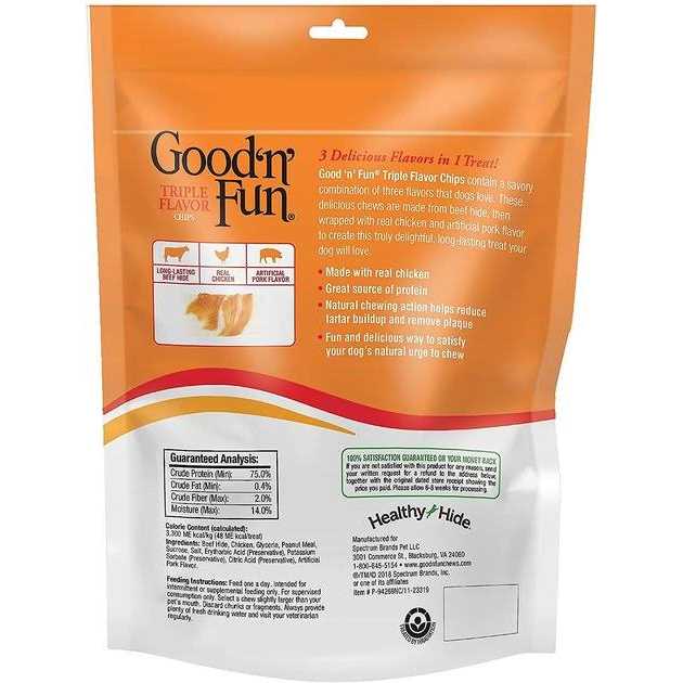 Good n Fun brand contains a savory combination of flavor that dogs love most. These delicious chew treats are made from the finest ingredients, including delicious beef hide, to create truly delightful, long-lasting treats your dog will love.Good n Fun Triple Flavor Chips contain a savory combination of three flavors dogs love. These delicious chews are made from long-lasting beef hide, then wrapped with real chicken and artificial pork flavor to create this truly delightful, long-lasting treat your dog will love. Made with real chicken, these chews are a great source of protein for dogs of all sizes. Good n Fun Triple Flavor Chips are a fun and delicious way to satisfy your dogs natural urge to chew, while the natural chewing action helps reduce tartar buildup and remove plaque. Feed 1 chew to your dog daily and always supervise your dog while consuming.