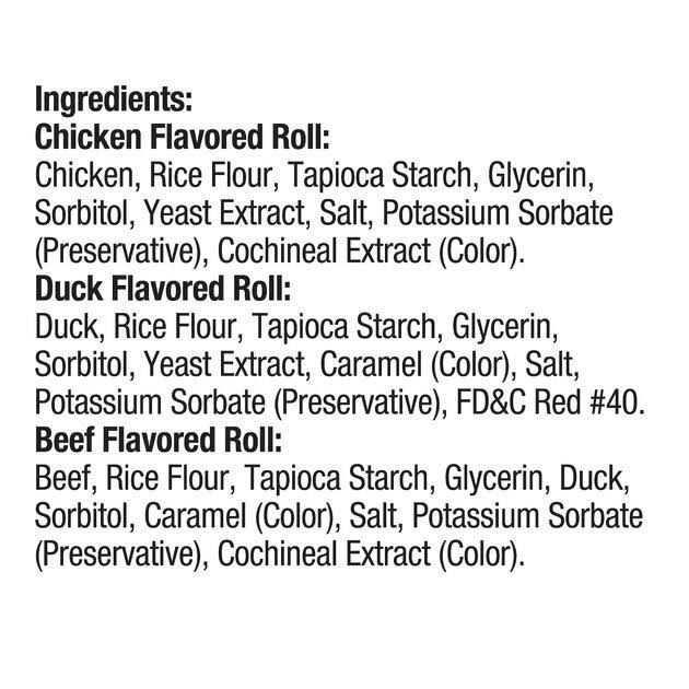 These flavor-packed Good n Tasty Soft & Crunchy Rolls are made with real chicken, duck or beef, so theyre sure to get your dogs tail wagging. With a soft outside and a crunchy inside, these rolls are bursting with flavor, and the exciting variety of textures will keep dogs satisfied. With three exciting flavors premium chicken, wholesome duck and tasty beef these snacks offer a good source of protein for a tasty treat your dog will love. Good n Tasty Soft & Crunchy Rolls bring the fun and the flavor making them a scrumptious way to satisfy your dogs natural urge to chew. This variety pack contains chicken flavored rolls, duck flavored rolls and beef flavored rolls. Feed your dog one Good n Tasty Soft & Crunchy Roll per day. Intended for intermittent or supplemental feeding only. For supervised consumption only. Select a chew slightly larger than your pets mouth. Discard chunks or fragments. Always provide plenty of fresh drinking water and visit your veterinarian regularly.