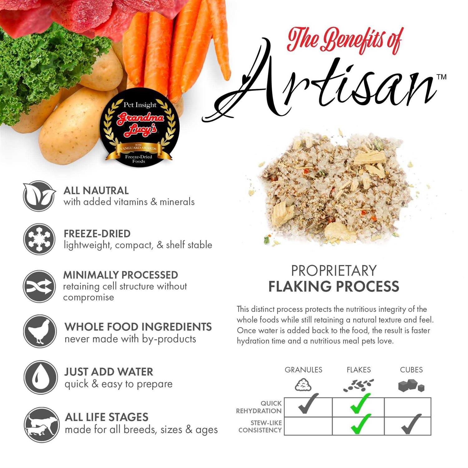 Since 1999, Grandma Lucy’s has maintained a reputation for making only the best pet treats and are constantly developing new products packed with leading-edge nutrition and innovative design. That is why when you choose any of Grandma Lucy’s many products, you know you are making the right choice for your pet. Key Benefits Easy to prepare freeze-dried recipe: just add warm water, mix and serve. Ready in just 3 minutes! With premium ingredients like USDA venison that is hormone and antibiotic free, potato, flaxseed, apples, blueberries, and cranberries A great option for pets prone to food sensitivities and digestive upset. Rich in natural omega fatty acids that help maintain a healthy skin and coat and healthy joints All natural, with no grains, by-products, preservatives or GMOs Provides complete and balanced nutrition for all life stage. Freeze-Dried, Grain-Free Food ARTISAN Combines tasty tidbits of meat, potatoes, carrots, apples, blueberries and cranberries, and some recipes add bananas, pumpkin, and sweet potatoes. PUREFORMANCE These recipes start out with chicken, rabbit, goat, lamb or fish, plus wholesome chickpeas, a low-glycemic legume that’s full of protein, folic acid and fiber. VALOR Tasty chicken, turkey or fish is the main course, and quinoa is added as a gluten-free superfood that offers extra protein and amino acids. MACANNA This food helps increase your pet’s nutrient intake with superfood ingredients like hemp hearts, coconut, kale and turmeric.