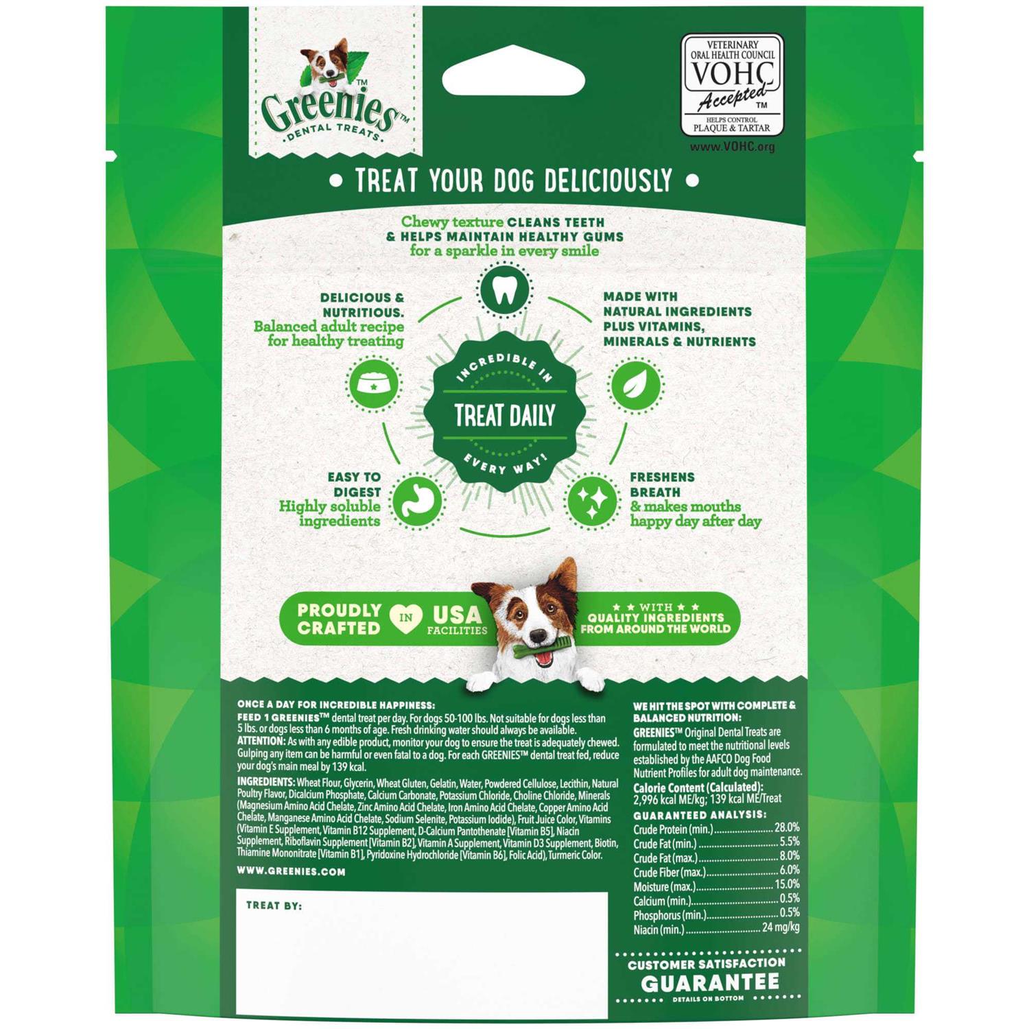 One GREENIES Original Dental Treat a day is all it takes for clean teeth, fresh breath and a happy dog. Your dog can’t wait to sink their teeth into these delicious, original,flavor dental dog chews because they feature a delightfully chewy texture that fights plaque and tartar. Irresistibly tasty and incredibly powerful, GREENIES Treats for Dogs are recommended by veterinarians for at,home oral care. Best of all, these natural dog treats are made with highly soluble ingredients that are safe and easy to digest. Give your dog the mouth,wowing treat that helps promote their overall health with GREENIES Dog Treats.
