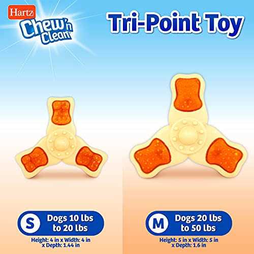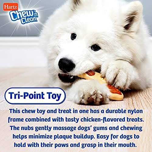 Hartz Chew n Clean Tri-Point dog chew toy and treat in one satisfies your dogs desire to chew! This dog toy has a durable nylon exterior is embedded with chicken-flavored treats for moderate chewers. The dog toy has shape contours and nubs that help keep teeth clean, remove tartar while also gently massaging your dogs gums. The fun and functional tri-point shape is designed to be easy for small dogs to hold and grasp. Always supervise your pup and select appropriate toys for both your dogs size and chewing habits.
