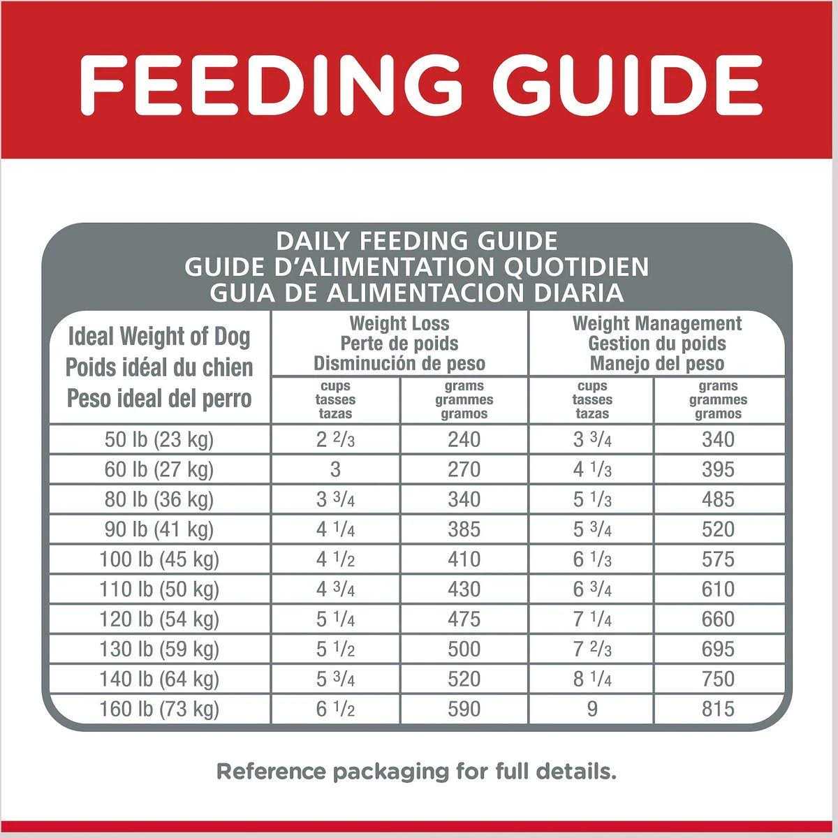 Size: 30 LB Just because your dog is big in size, it doesnt mean their pet food should be big in calories. Hills Science Diet Large Breed Light Adult dry dog food is precise nutrition for less active adult large breed dogs that require a low-calorie pet food to maintain a healthy weight & lifestyle. This dog food made with natural ingredients provides L-carnitine to promote an ideal bodyweight and healthy heart function, healthy mobility, in your big canine. High-quality protein and natural fibers help your dog stay satiated between each meal, while omega-6s and vitamin E nourish your large dogs skin and support a shiny, healthy coat. Theres more to love with the new look of Science Diet. Some of our products also have new names, new kibble shapes & new formulas. Feeding Instructions Ideal Weight of Dog Weight Loss (cups) Weight Management (cups) 50 lb 2 2/3 3 3/4 60 lb 3 4 1/3 80 lb 3 3/4 5 1/3 90 lb 4 1/4 5 3/4 100 lb 4 1/2 6 1/3 110 lb 4 3/4 6 3/4 120 lb 5 1/4 7 1/4 130 lb 5 1/2 7 2/3 140 lb 5 3/4 8 1/4 160 lb 6 1/2 9 Adjust feeding amounts as necessary to maintain optimal weight. If you are unsure, ask your veterinarian. Transition Instructions A gradual transition to a new pet food is important to avoid digestive upset. To transition, mix your pets current food with the new food. Over 7 days, gradually decrease the amount of the current pet food while increasing the amount of new pet food.