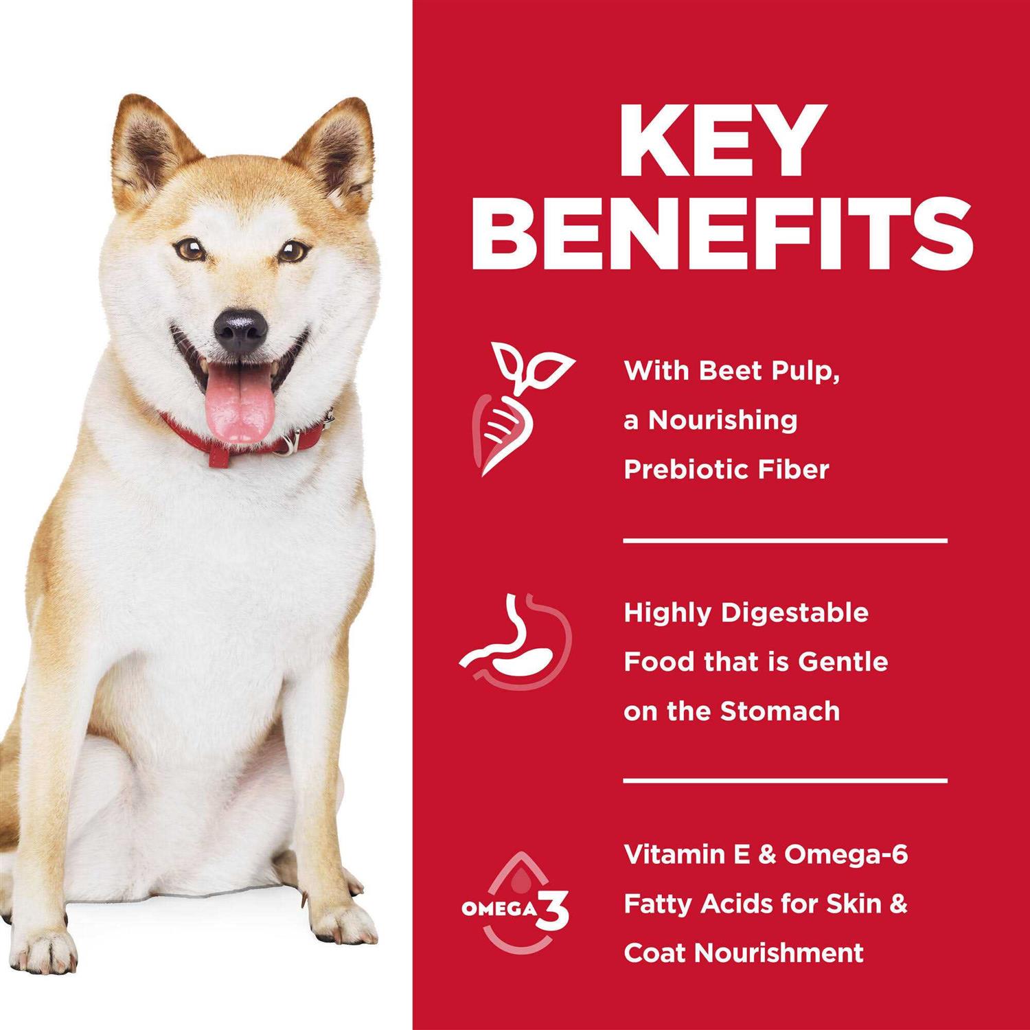 Hill’s Science Diet Sensitive Stomach & Skin dry dog food is highly digestible for optimal nutrient absorption & easy stool pick-up. Gentle on stomachs while nourishing skin & promoting a lustrous coat. With beet pulp, a nourishing prebiotic fiberHighly digestible food that is gentle on the stomachVitamin E & Omega-6 fatty acids for skin & coat nourishmentNatural ingredients with added vitamins, minerals and amino acids.