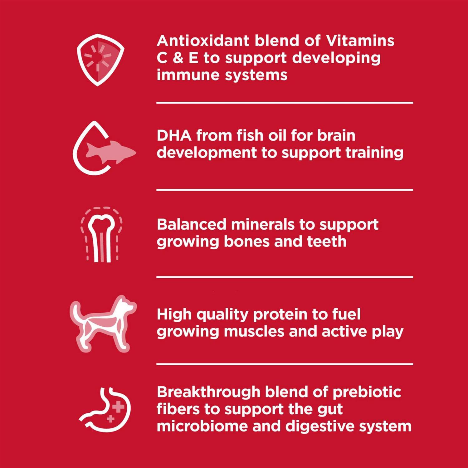 - This dry puppy food uses DHA from fish oil to support healthy brain & eye development