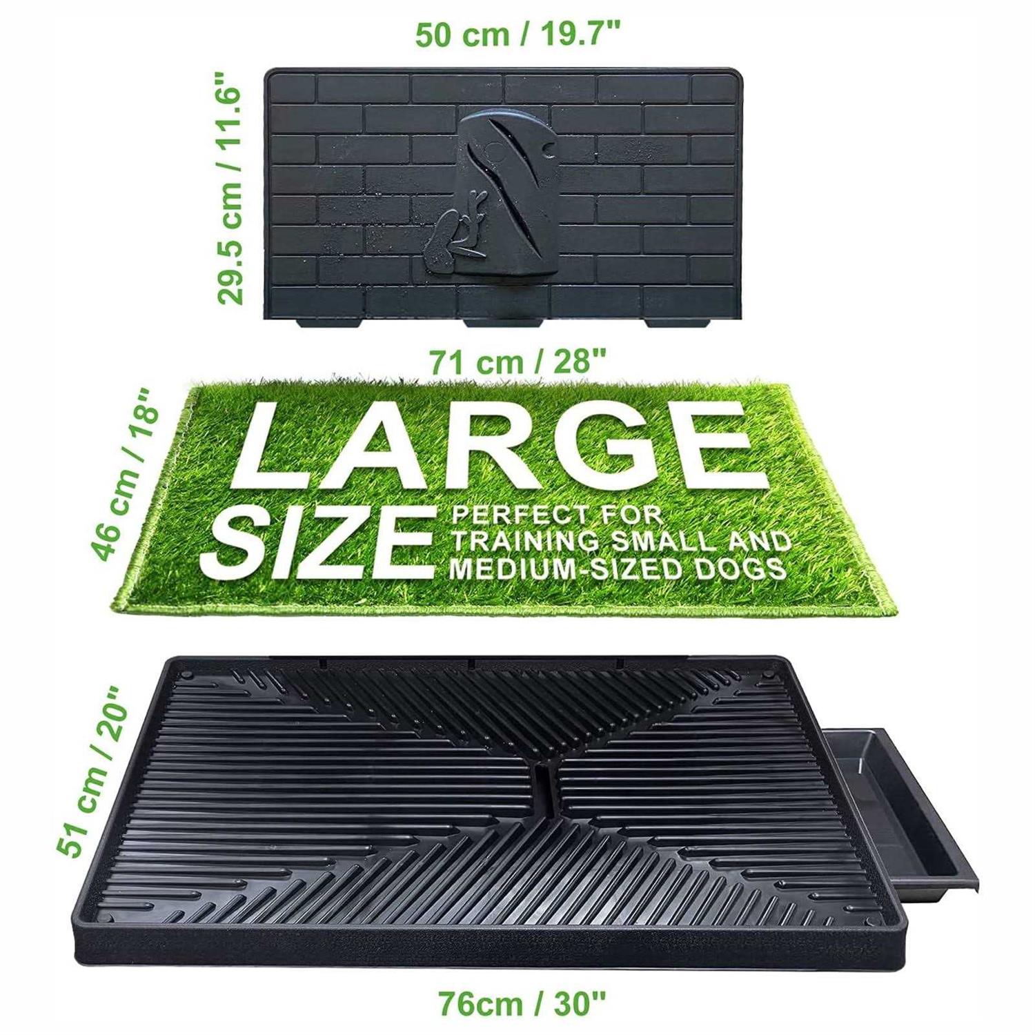 The pee baffle guides the pet to urinate while preventing urine splashing. Permeable Grass Mats The grass looks and feels just like real grass while being completely comfortable for your pet. Detachable Grid Tray Holes from the detachable grid tray allows liquid to drain to the bottom base tray, so grass mat is always dry and ready for use. Synthetic Plastic Grass Mat The grass looks and feels just like real grass while being completely comfortable for your pet. Bottom Insert Tray Bottom insert tray detaches from grid tray for an easy and mess free clean up. Simply rinse and wash with soap and water.