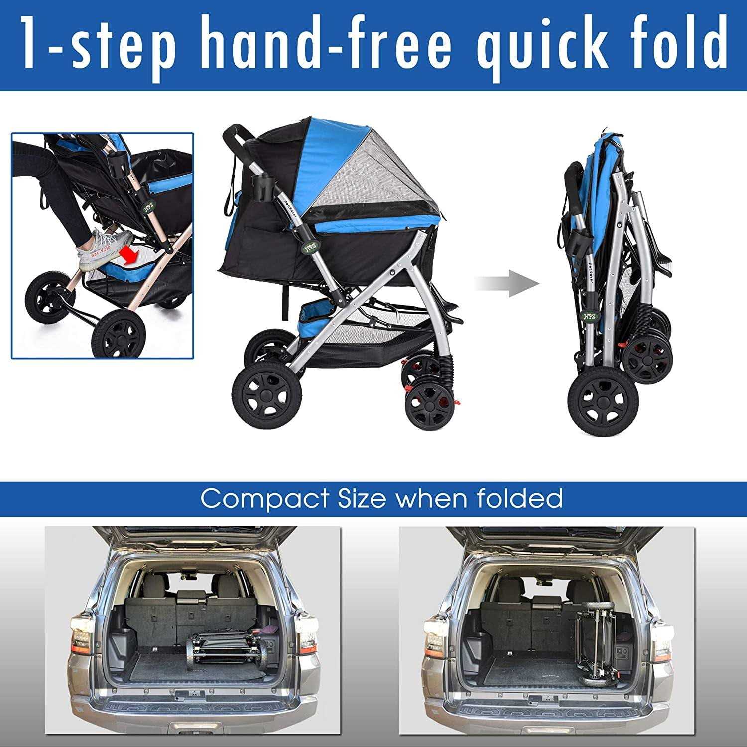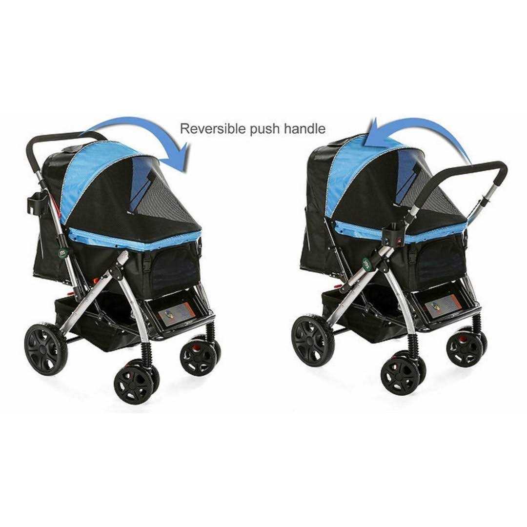 Unlike other pet strollers, our breathable mesh cover is made of high-density Oxford 1600D while others are made of odorous rubber. With its reversible handle bar, 360 degree rotating ComfortRide-WheelsTM, anti-vibration suspension and rear braking system, this pet stroller offers the ultimate ride comfort and is easy to use. This stroller features one-hand simple mechanism that can quickly fold and unfold it in seconds, and takes up minimal space when folded. Extra-wide aluminum frame is extremely durable and lightweight, yet can still hold an animal weighing up to 75 pounds! Inside this heavy-duty all-terrain travel carriage, there are two durable and removable mats that provide scratch/stain-proof protection and are super easy to clean. In addition, the expandable pet compartment can be easily converted it to hold two small pets or one large pet, as it comes with two safety belts. This versatile pet stroller has one underneath large storage compartment, plus three rear accessory bags, and a holder for bottles, cans, etc. Buying this stroller means you can take your beloved animals on all of your daily tasks with ease!