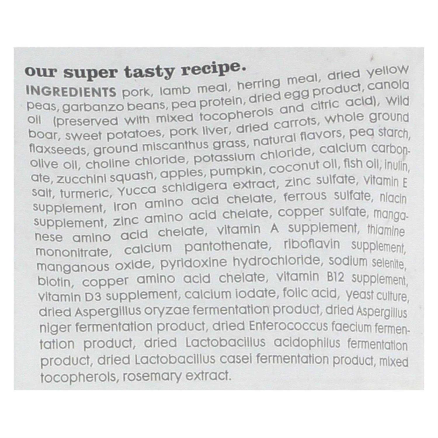 - Grain-free, high-protein, heart-shaped kibble that features real pork as the first ingredient.