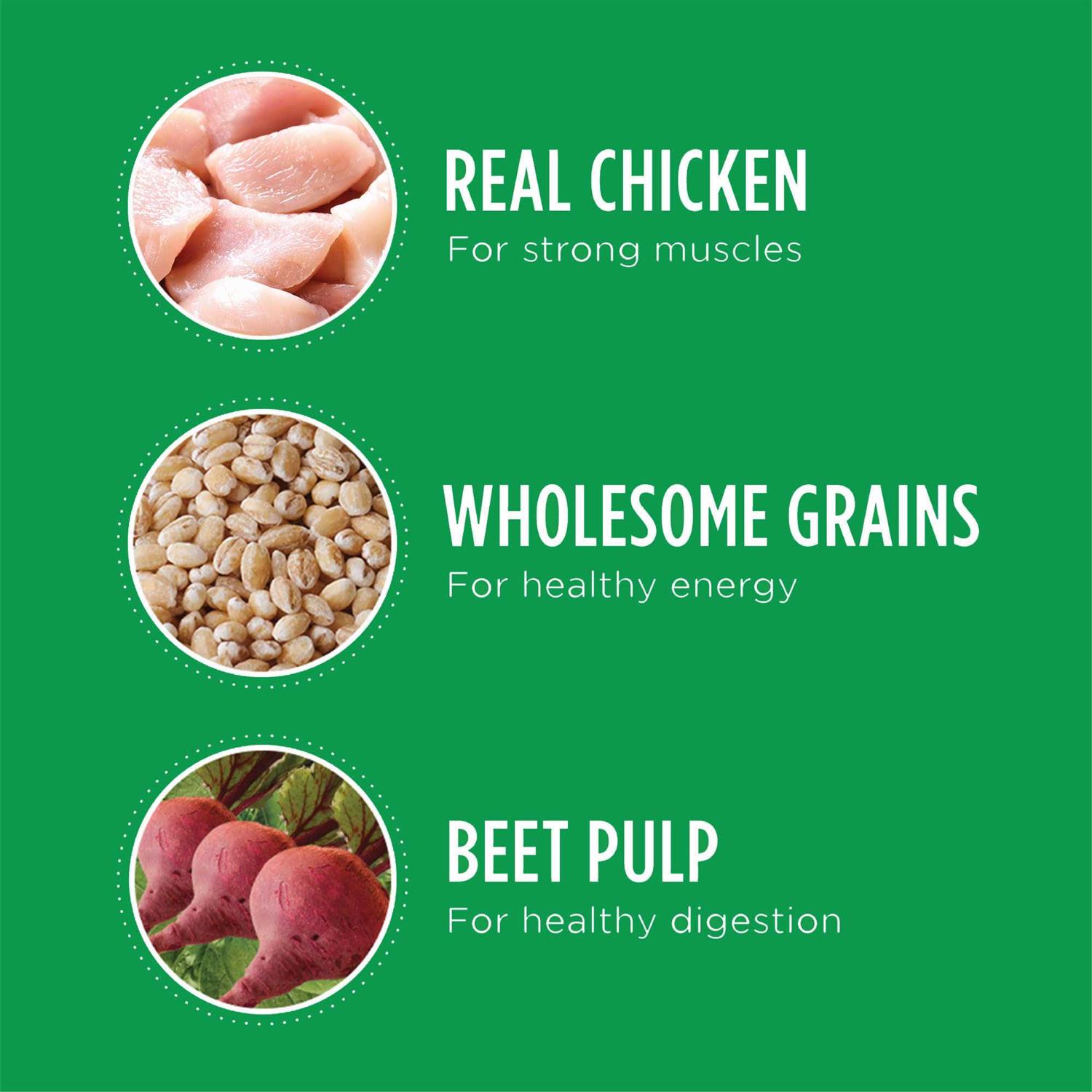 Dry Dog Food is formulated specifically for all dogs 1+ years old. This formula is designed to help build strong, firm muscles by sourcing natural chicken and eggs. The added PreBiotics will help promote a healthy digestive tract and strong defenses. This formula is enriched with antioxidants to help maintain a strong immune system. The unique shapes of the kibbles will help reduce plaque and tartar buildup. 100% complete and balances with no fillers or artificial preservatives.