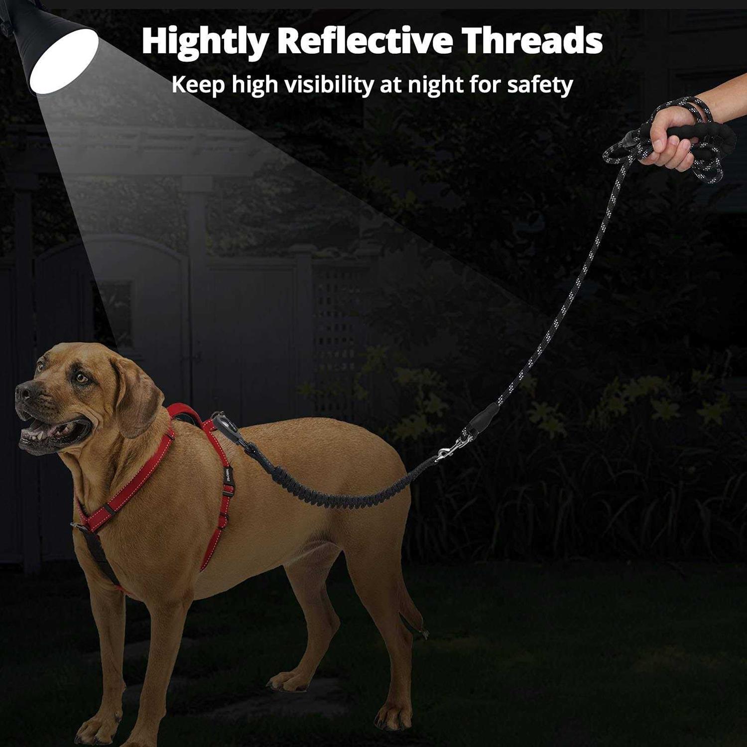 Newly Added Accessory:Shock Absorbing Reflective Bungee uses innovative Zero Shock BUNGEE Technology perfect for control and cushion the pulling, effectively slowing down the tension on the hand, reducing laborious traction, which makes dogs’walking enjoyable! Our great large dog leashes is made of ultra-durable and wear-resistant nylon rope, and stitched with reflective line along the length of the dog leash thick rope, highly visibility at night, keeps you both safe and high visibility on your late-evening walks at night Comfortable padded foam handle:ergonomically designed non-toxic soft padded handle for extra comfort,which provides a firm grip.Enjoy the feeling walks with your dog and protects your hand from rope burn for amazing comfort and control. Great for Walking,Running and Trainning:This long dog leash for large dog give enough freedom to your dog and everything absolutely under your control.The diameter of 1/3 inch can meet small dogs, cats or other small animals. The diameter of 3/8 inch and 1/2 inch is the best choice for training leashes for large dogs or medium dogs. dog leash suitable for outdoor sports such as hiking,camping,training,hunting,backyard,beach, mountaineering, walking, running, etc. Our products provide style and function while still keeping in mind the quality and longevity of each and every product. Rope Style Dog Leash For Small medium or large dogs Do you want to improve your dog walking experience, or do you want to exercise your dog at night, also do you want to give your friends a big surprise as a gift, this is the right dog rope leashes for large dogs and medium dog you should try! It’s also great for jogging, running, camping and hiking, enjoy a good time with your pet! Upgraded 360°Swivel Lockable Hook:Professional Swivel clasp prevents the dog leash from twisting and dog getting tangled,Let your dog run freely anytime,anywhere Newly Added Accessory: Bungee Dog Leash effectively slowing down the tension on the hand, reducing laborious traction, which makes dogs’walking enjoyable Durable:Strong nylon rope and solid tangle free clasp. Comfortable:Ergonomic foam handle gives you amazing grip feeling. Reflective:Perfect for night safe walking. Reasonable:Cost-effective for your wise choice! This dog rope leash long is great for everyday walks with your furry friend. Whether you’re headed to a doggie playdate or just adventuring around the block, this large rope leash for dog will keep your dog close by your side.