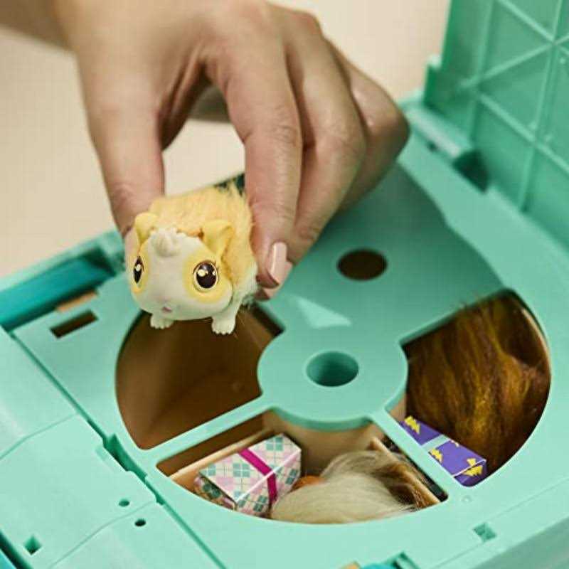 IT FROM XUQCAH MATERIAL AND TALENKEB PAR ENT NURTURE YOUR MAMA GUINEA PIG: Nurture your mama by patting her, feeding her and brushing her to make her heart light up; Then place her back in the hutch REPEAT PLAY!: You can reload the hutch and play again and again! STYLE BABIES WITH SURPRISE ACCESSORIES: Open the hutch and find a baby and it’s surprises! Style each baby with it’s own surprise accessories This soft, interactive Mama guinea pig comes with a deluxe, interactive hutch. Care for Mama by feeding her and brushing her long, beautiful hair with the accessories provided. With enough love and attention, Mama’s heart will start to glow, indicating that a baby is on the way! Gently place her inside her interactive hutch. Now it’s time to wait. Discover a new-born guinea pig baby and a special care package. Care for Mama again and you will find new babies to complete your adorable guinea pig family! There are 3 adorable babies to discover, each with their own care package that includes: a birth certificate, 2 accessories, and 2 hair elastics. Dress and style up the babies into 3 cute looks: Rock ‘n’ Roll, Preppy and Princess babies! This magical experience is repeatable, so that you can go through the surprise and delight of caring for Mama and discovering her babies, again and again. Batteries included.