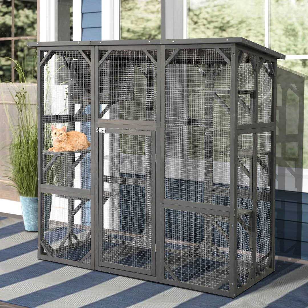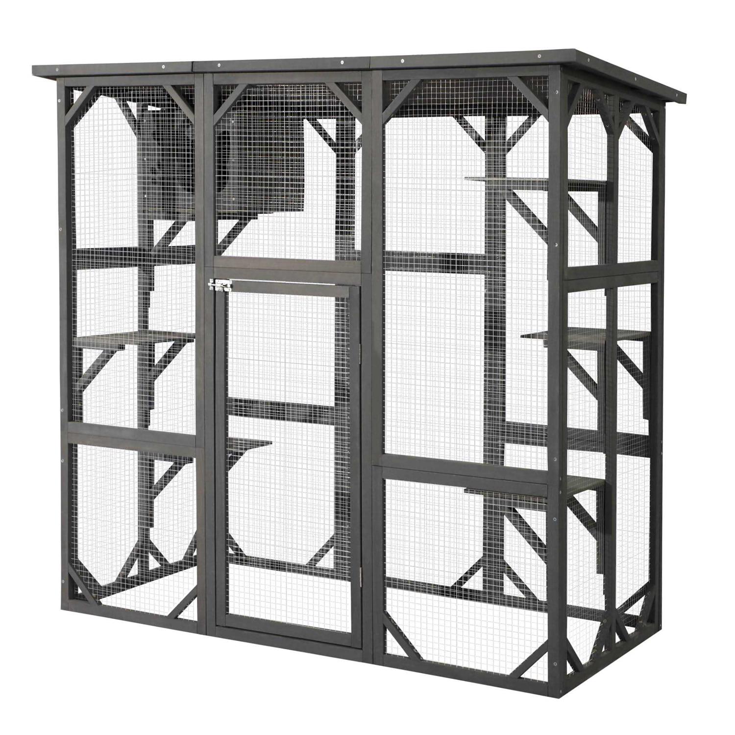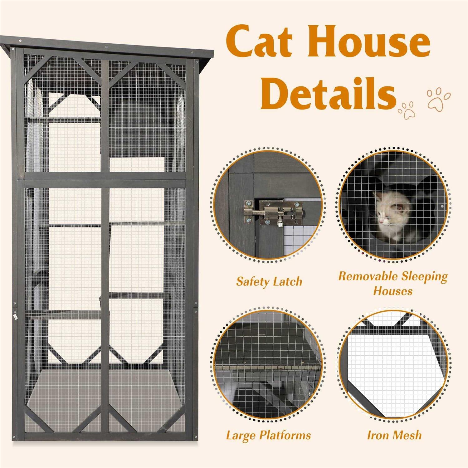 This cat house is made of high-quality spruce wood and wire mesh, which is safe and durable. The top of the cage is covered with waterproof asphalt, so you don’t have to worry about your cat getting wet when it rains. The space is very large, with many jumping platforms, which are suitable for one cat or multiple cats to move freely. You can observe any of their activities from any angle. The door of the cat cage is large enough, not only cats can enter and exit freely, but also people can enter and exit freely, which is convenient for feeding cats and cleaning the cat cage. The door of this cat cage can be locked to ensure the safety of the cat. This cat cage is not only suitable for cats but also perfect for single or multiple pets, as well as domestic dogs, squirrels, foxes, and other small and medium pets.