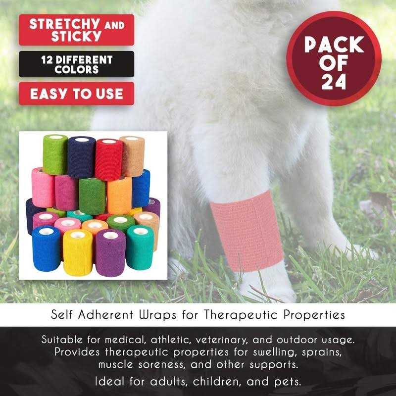 Item Description AThis pack of cohesive bandage rolls is a versatile essential for first aid and support. With 24 rolls of colored elastic bandage wrap, it’s ideal for wrapping injured ankles, wrists, fingers, toes, elbows, or knees. This self-adherent wrap offers exceptional support for sprains, swelling, and strains, making it a valuable addition to classrooms, offices, and homes for emergencies. It’s not just for medical use; it’s also great as vet tape for dogs and cats, horse wrap bandages for hooves and legs, tattoo tape wrap, or for creative purposes like costume designs, cosplay outfits, and crafts requiring flexible materials. Each roll measures 3 inches by 5 yards and adheres to itself, with stretchable fabric for superior elasticity. The bandage offers a strong and durable hold, making it suitable for active individuals and animals. This bulk supply includes 24 rolls in 12 assorted colors, ensuring you’re always well-prepared for minor injuries or support needs at home, in your classroom, or in your sports supplies.