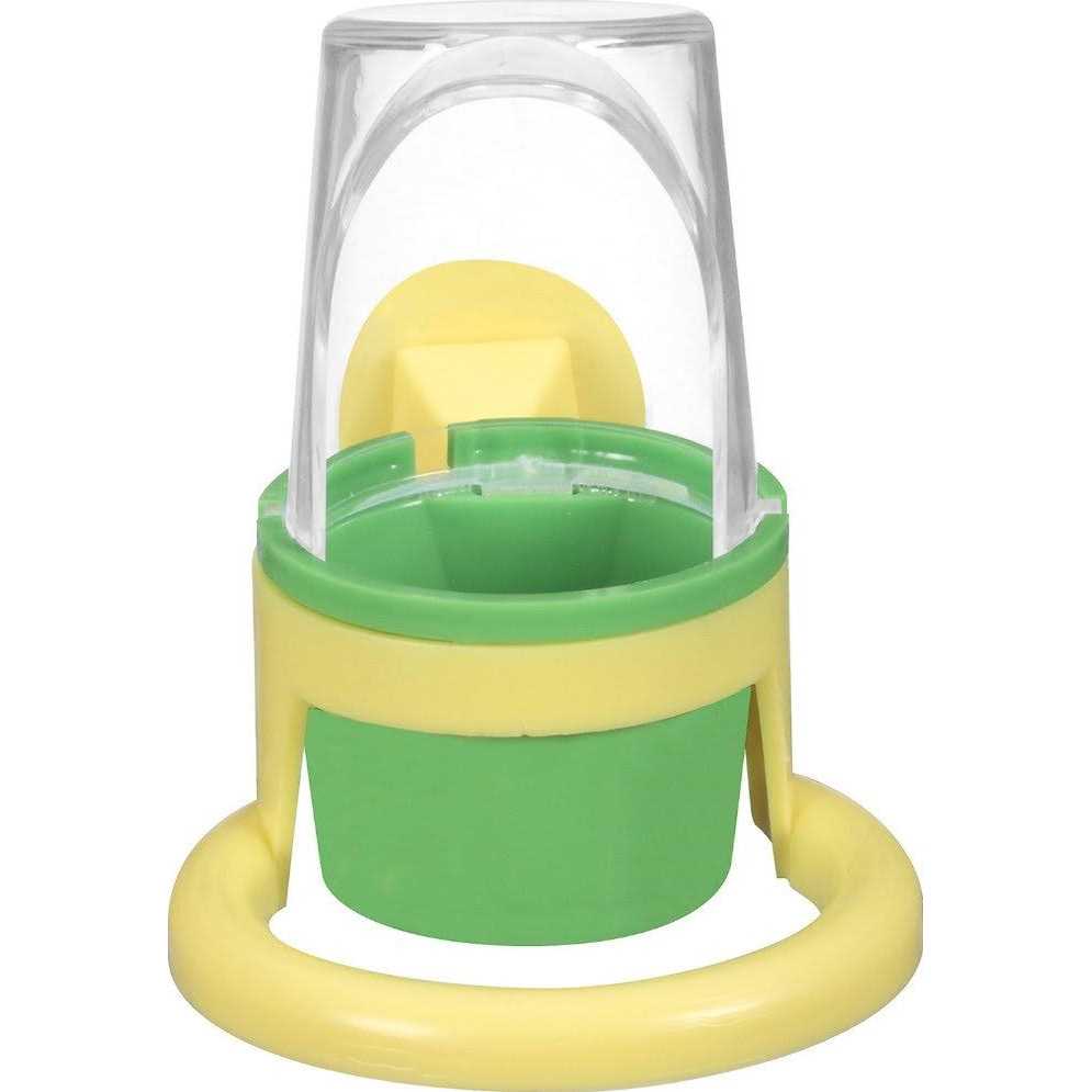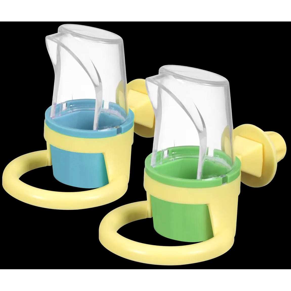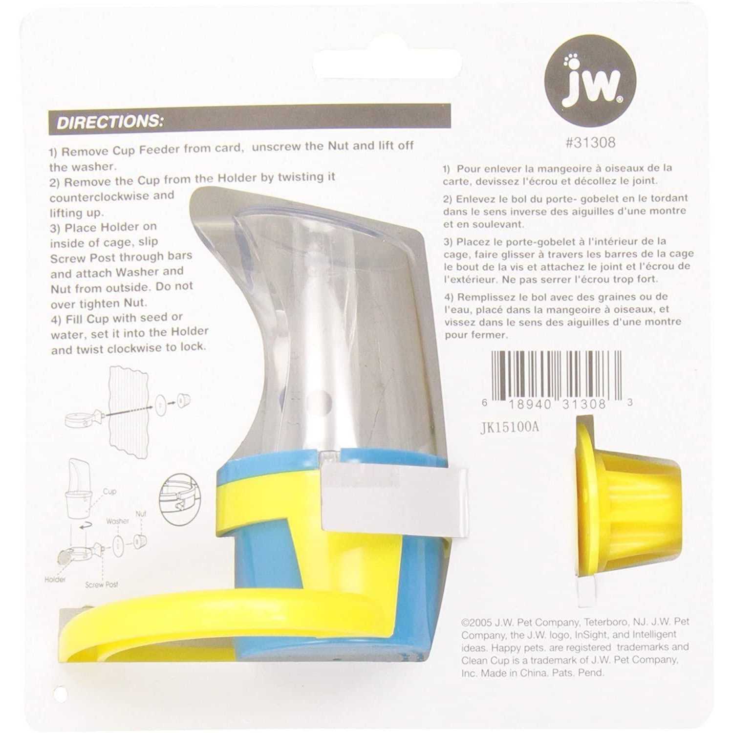 The JW? Pet Clean Cup Feed & Water Cup is easy to attach to any bird cage. It can quickly be removed and refilled so your pet bird has a clean supply of food or water. The clear plastic hood acts as a guard that keeps debris inside the cage and doesnt block visibility so that your pet bird feels comfortable and safe placing its head inside to eat or drink. This easy-to-clean pet bird accessory fits all bird cages, including vertical and horizontal bars with a clever screw-on design. The cup is easily twisted and lifted to remove it from the holder for quick cleaning. The cup is durable and dishwasher safe. The small size is perfect for parakeets, canaries, and other small birds. The medium size is great for cockatiels, conures, lovebirds and similarly sized parrots, The large size is suitable for larger pet birds such as parrots and macaws.