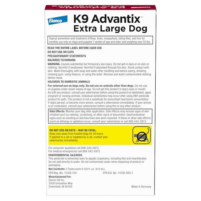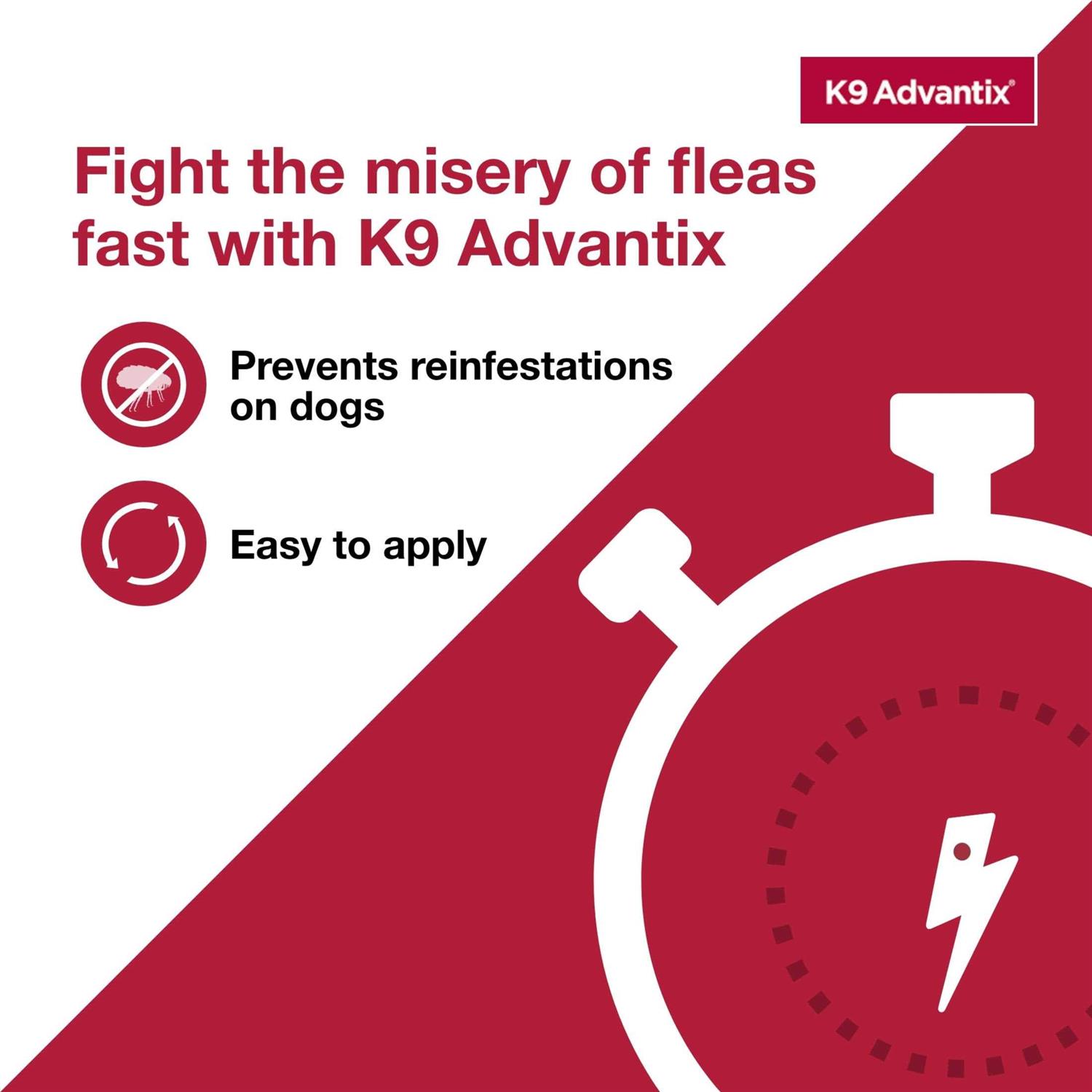K9 Advantix kills and repels fleas, ticks, mosquitoes, biting flies and lice. Simpler than a flea collar and hard-to-swallow pills, this topical formula works within 12 hours of initial application to stop existing flea infestations on dogs and prevent new ones by killing adult fleas on contact before they lay new eggs or bite your dog. K9 Advantix offers fast relief at an excellent value, so you and your dog can get back to the things you love most. Your dog should be at least 7 weeks old and weigh over 55 lbs. to use K9 Advantix Extra Large Dog. Use as directed by label. Do not use on cats.