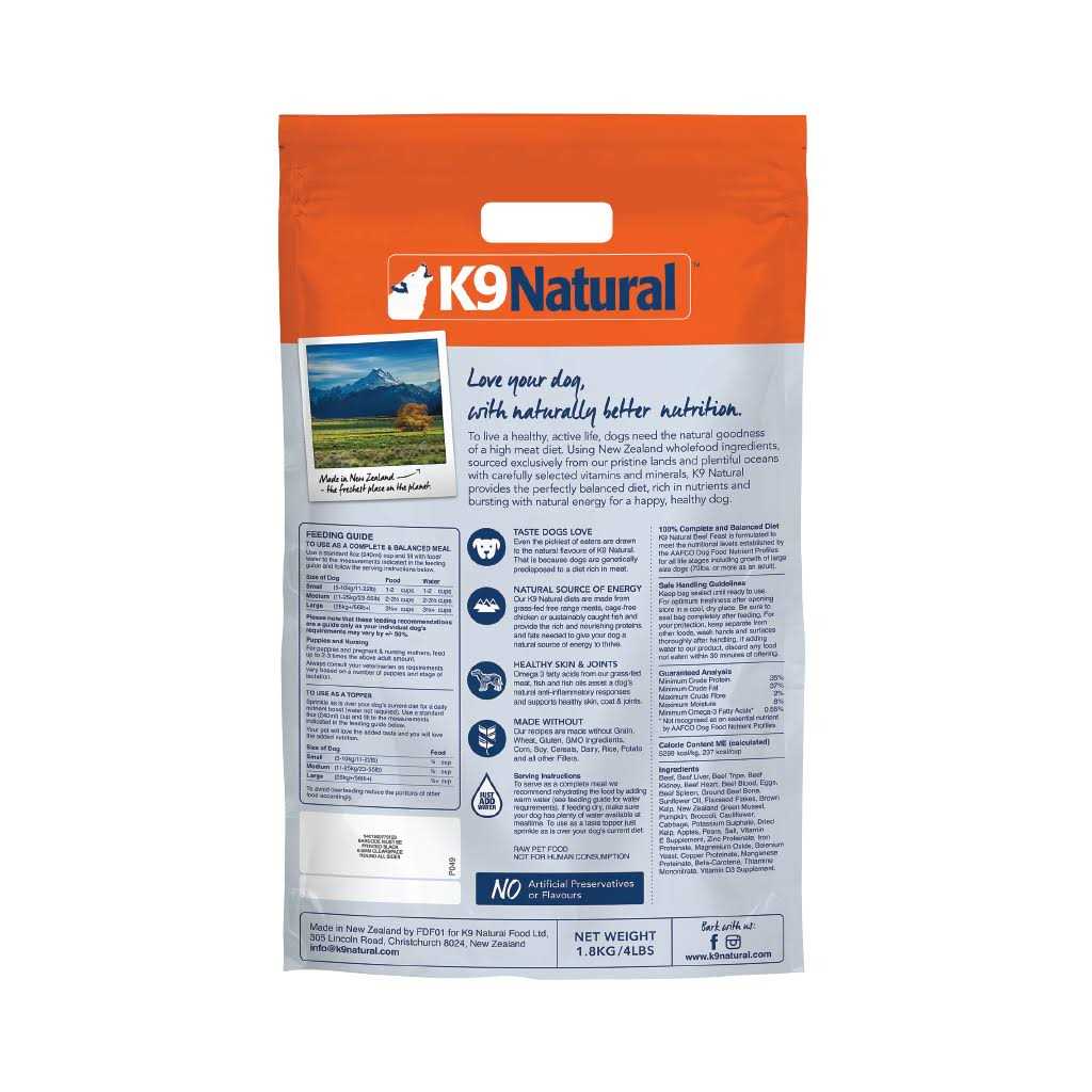 High Meat, Freeze Dried Dog Food Wherever you are – shows and events, camping, hiking, hunting or on holiday – your dog need never be without the natural, raw food you know it deserves! K9 Natural Freeze Dried requires no refrigeration and comes in lightweight portable packs. Mix with a little warm water (see instructions on the pack) and you have an instant, nutritious raw meal for your canine. K9 Natural is a revolutionary, New Zealand-made raw dog food which combines the natural goodness of fresh whole foods with an absolute commitment to the true nutritional needs of canines. The result is a dog food of exceptional quality and convenience. 100% natural and raw, K9 Natural contains only quality ingredients and absolutely no additives, artificial preservatives, wheat, wheat gluten, rice, rice gluten, cereal bulking agents or corn. Based on the actual diet of the domestic dog’s closest relative, the Grey Wolf, K9 Natural is made with 90% real meat, bone and organs. K9 Natural doesn’t contain any artificial coloring, flavorings or preservatives. There are also absolutely no cooked ingredients because cooking significantly reduces the nutritional value of food.