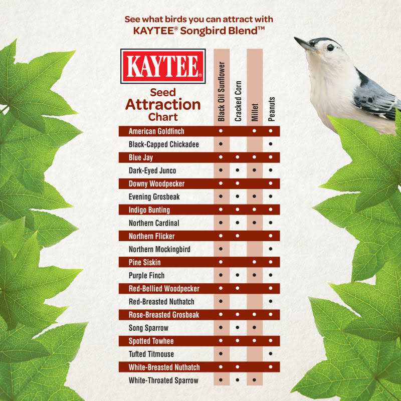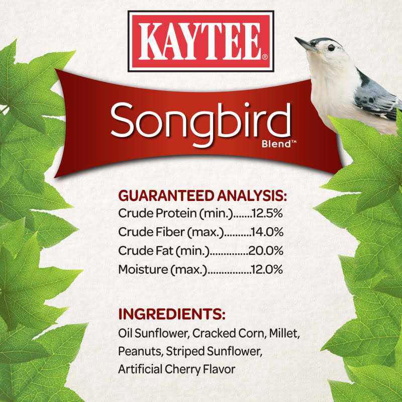 Kaytee Songbird Blend is one of the highest energy wild bird foods available, specially formulated to attract more colorful songbirds year-round. This unique blend of premium seeds and grains includes peanuts to add even more energy to a mix already rich with black oil sunflower seeds. Kaytee Songbird Blend will make your backyard a favorite place for beautiful songbirds. Reseal package and store in a cool dry place, preferably in a sealed container. This will protect against insect infestation that can naturally occur with any whole grain seed product.
