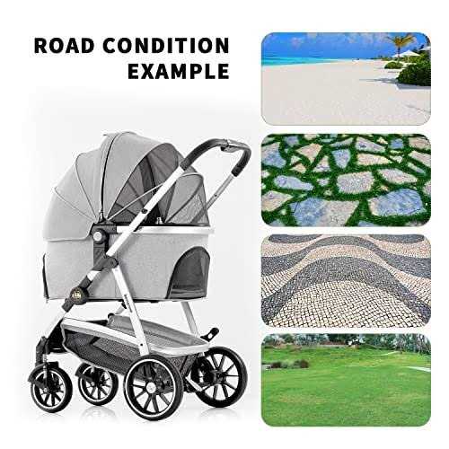 600D Oxford Cloth Dimensions: Kenyone C510 measures 29.5″L x 22.8″W x 41.7″H, folded dimensions: 32.7″L x 19.6″W x 9.8″H. The outer carriage is 27.1″L x 16.9″W x 25.9″H and the inner carriage is 25.2″L x 14.2″W x 21″H . It can accommodate 3-4 ‘dog stroller for small dogs 10 lbs’, two ‘dog stroller for medium dogs 20 lbs’, or one ‘dog stroller for large dogs 50 lbs’. Sturdiness & Ease of Use: Kenyone C510 dog stroller has a lightweight Aluminum Alloy frame, designed triangularly for superior stability. Large reinforced bottom basket; 10.5″ large rubber back rear. Weighing only 20.7 lbs, it can carry up to 60 lbs. It’s foldable for easy storage and requires no tools for assembly. ️ Wheel Quality & Safety: Kenyone C510 cat stroller’s solid rubber wheels offer a smooth, leak-free ride. The front wheel features double spring shock absorption for comfortable walks . The stroller’s one-foot brake and secure pet rope buckle enhance safety. Versatile & Convenience: The stroller features multiple mesh windows for enhanced airflow and visibility, and multiple entries for easy pet access. The carrier can function separately as a car seat. With easy assembly and foldability, your travels with your pet are made more convenient .