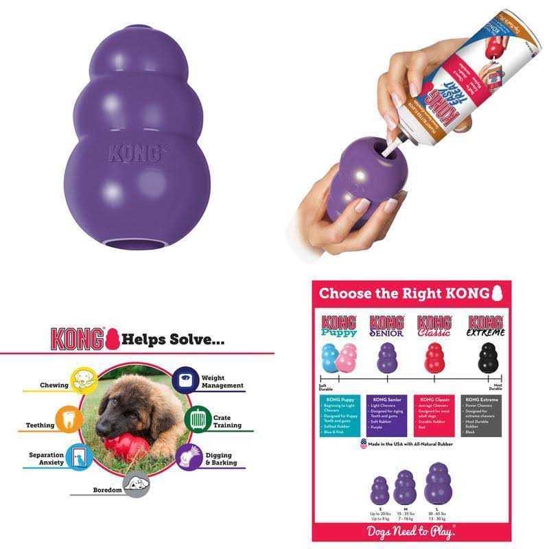 Use as a fetch stick that’s both safe and reliable Helps clean teeth and soothe gums Made in the USA. Globally Sourced Materials. Recommended worldwide by Veterinarians, Trainers and dog enthusiasts. The KONG Senior dog toy is customized for an aging dog’s chewing and play needs. The unique, natural KONG Senior rubber formula is designed for teeth and gums that have enjoyed chewing for years. Designed to provide a gentle and comfortable chewing outlet while offering enrichment and satisfying an older dog’s instinctual need to play. An erratic bounce make it perfect for dogs that are still playing as they reach their more dignified years. To extend play time be sure to stuff with kibble and a dash of peanut butter. Add to the fun by stuffing with KONG Snacks and top with KONG Easy Treat. Your wise pup still looking for a mental challenge? Be sure to freeze for a longer-lasting treat.