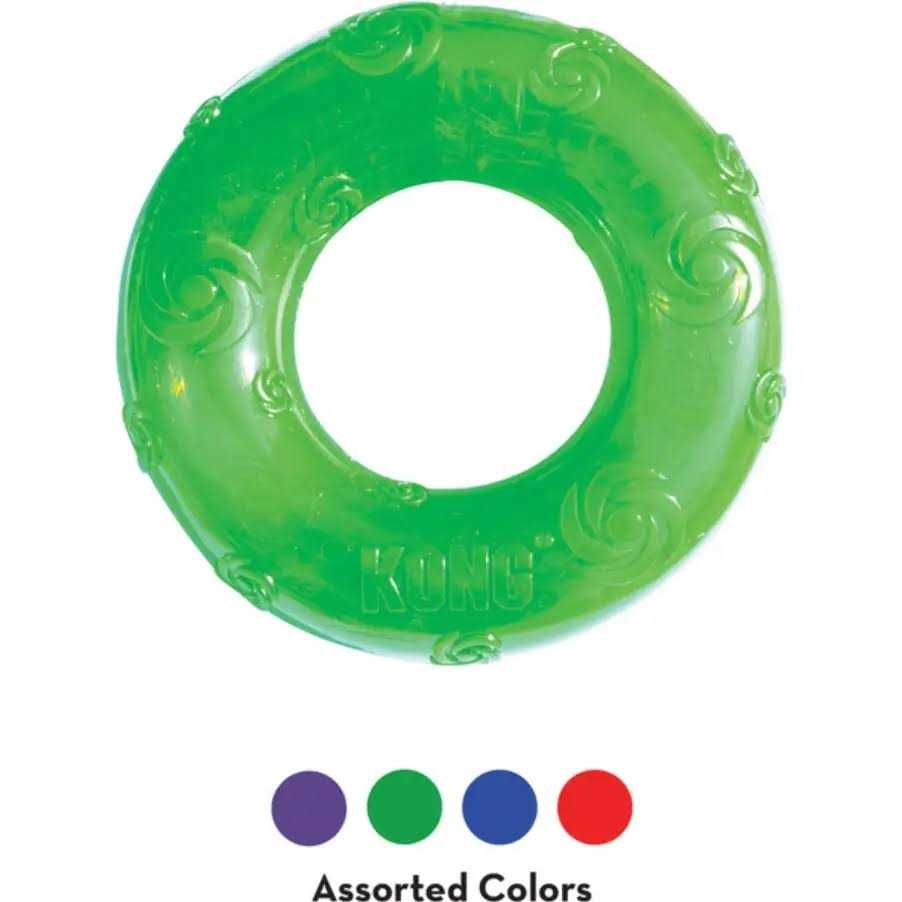 KONG Squeezz Ring Dog Toy provides hours of safe fun for your dog. Whereas most squeaky toys are easy to destroy or puncture, the KONGs Squeezz Ring Dog Toy features a completely safe, durable non-toxic rubber. Ideal for games of toss and fetch Protected recessed squeaker that’s easy to squeak Fun, erratic bounce keeps your dog guessing Large Squeezz Ring Dimensions: 6 Diameter With a protected recessed squeaker inside of the ring that your dog can’t reach, the fun won’t stop in the first day like it might with other toys. KONG’s unique design and raised surfaces make this ring toy bounce unpredictably, providing a fun chase and fetch experience for your dog. Please let us choose one for you!