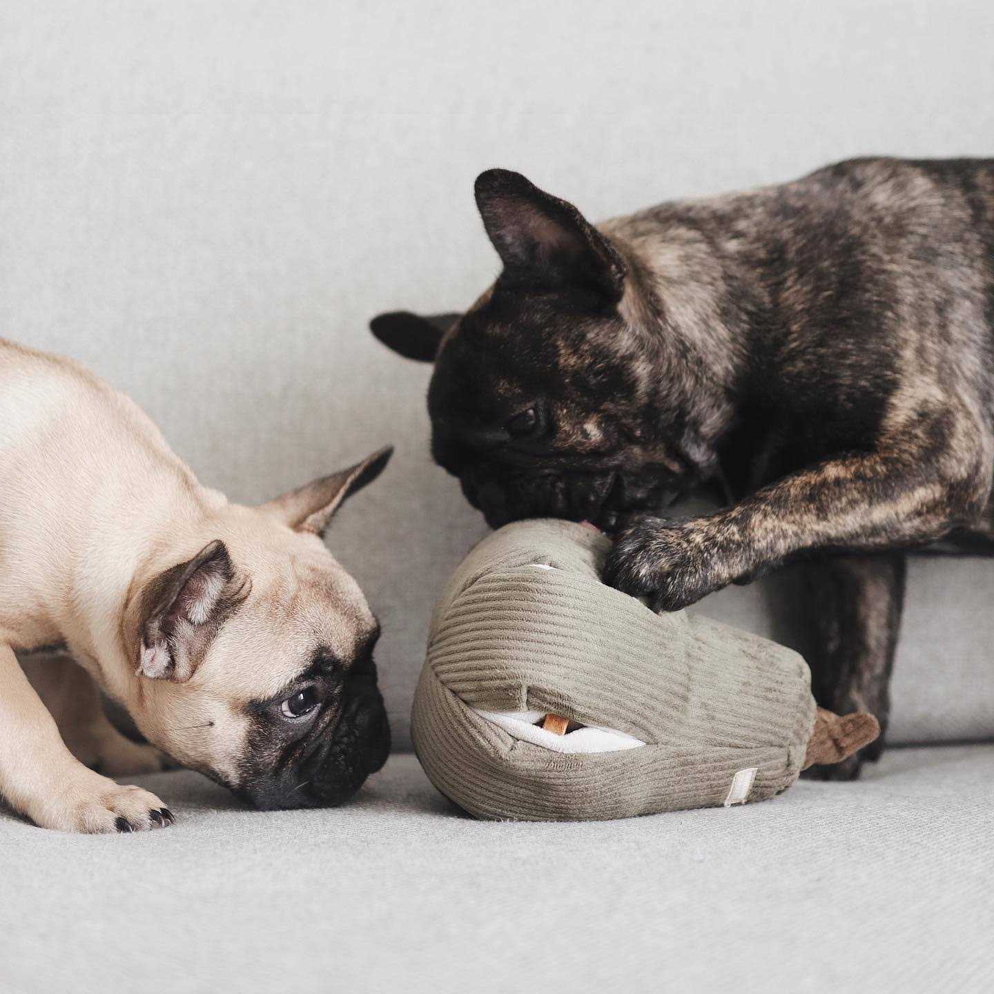 The enrichment BUTTERNUT squash from Lambwolf Collective features 6 treat pockets that open sideways as the snoot make its way in. The small has a super squeaker inside whereas the large has size small squeakers, making it extra fun!