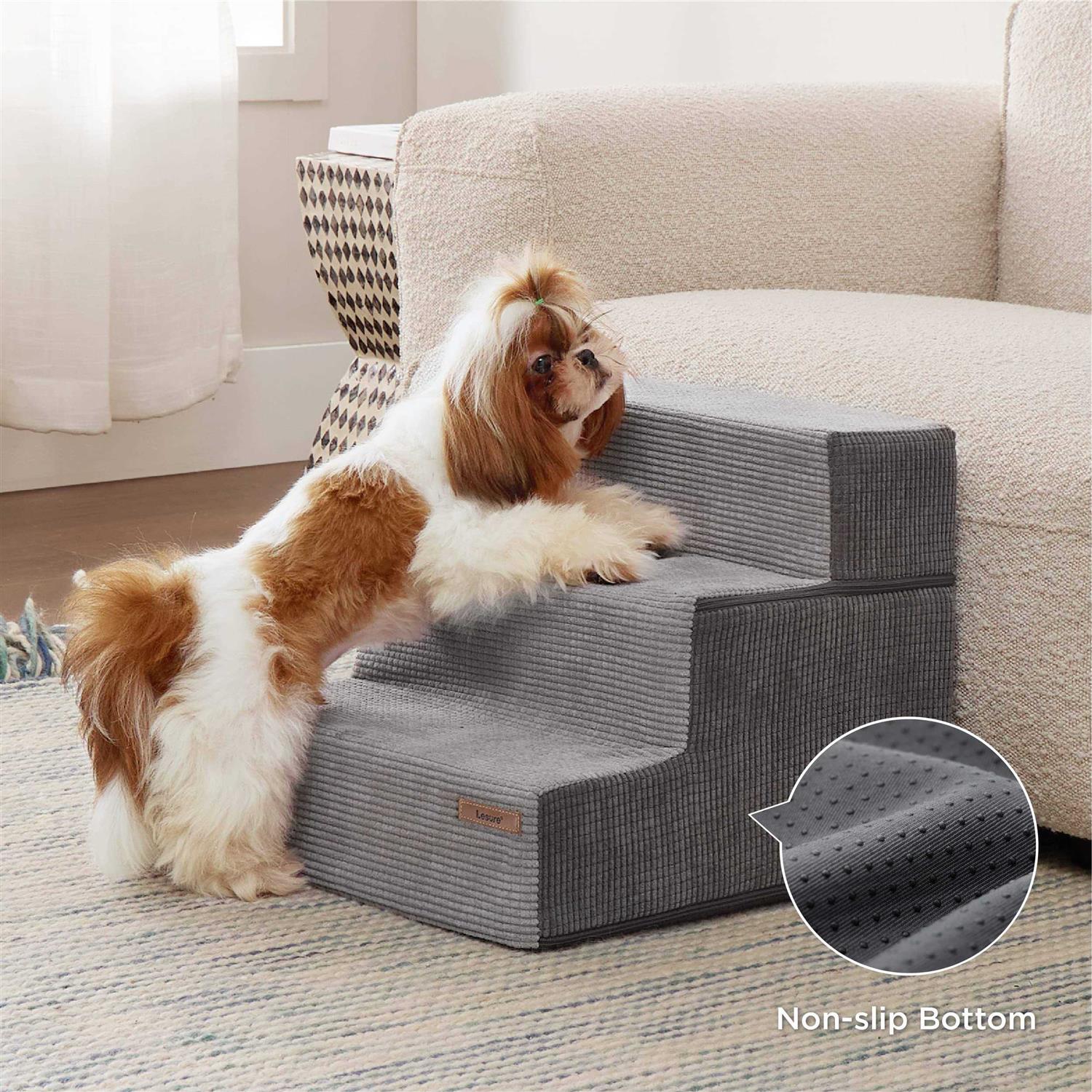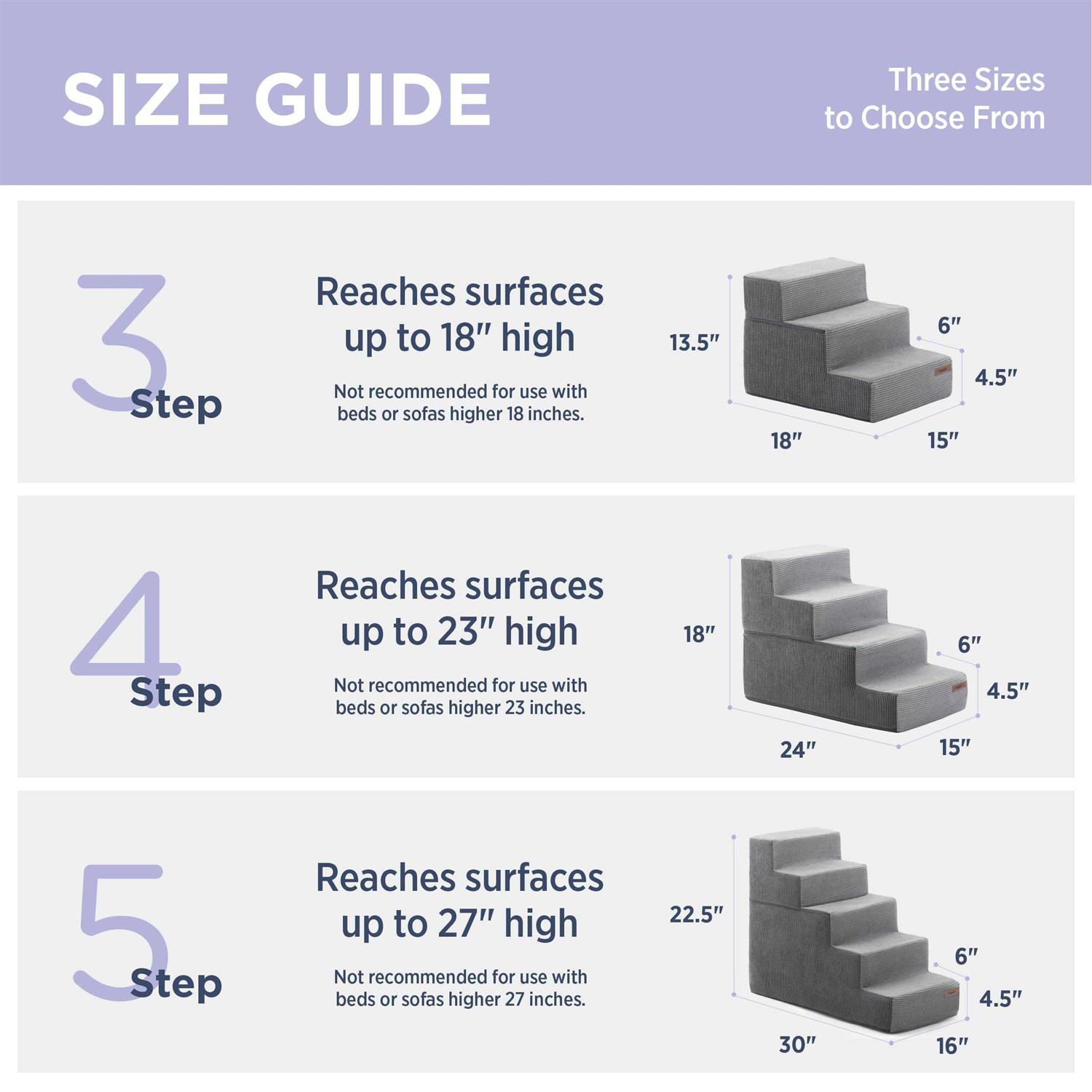 Brand: LE SUREColor: GreyFeatures: Easy Access: Lesure dog stairs give pets easy access to their favorite spots and are especially helpful for seniors who have trouble jumping and cats or dogs with joint problems. Plus, when it’s time for a snooze, the stairs fold into a soft, simple, pet-approved bed. High-Quality Filling: High-density, lightweight foam makes these pet stairs easy to move yet sturdy enough for cats and small/medium-sized dogs to walk up and down. Non-Slip Bottom: Rubber dots on the bottom provide extra grip, keeping the pet steps in place. Designed so you can feel confident that your furry friend will be able to get where they’re going safely. 3 Sizes to Choose From: The 3-step model is 13.5” tall to help small pets access low-to-the-ground couches or chairs. The 4-step version measures 18” for reaching sofas or a bed easily. The 5-step version is 22.5” and makes getting into higher beds or cars simple. Easy to Clean: Simply remove the foam core and medium-density fiberboard, then machine wash the outer cover separately in cold water on a delicate cycle. Do not machine wash or dry the foam core. Note: These pet stairs require installation. Please refer to the instruction manual or video for more details and remove the foam pieces from the compression bag, allowing the foam to fully expand over 24-72 hours. EAN: 6936574833772Package Dimensions: 16.5 x 7.8 x 7.3 inches