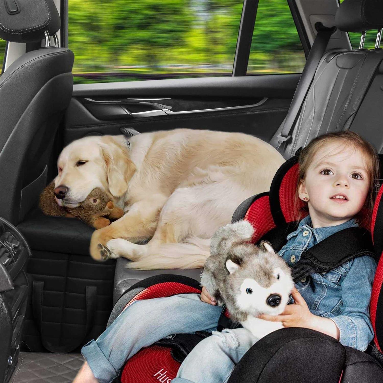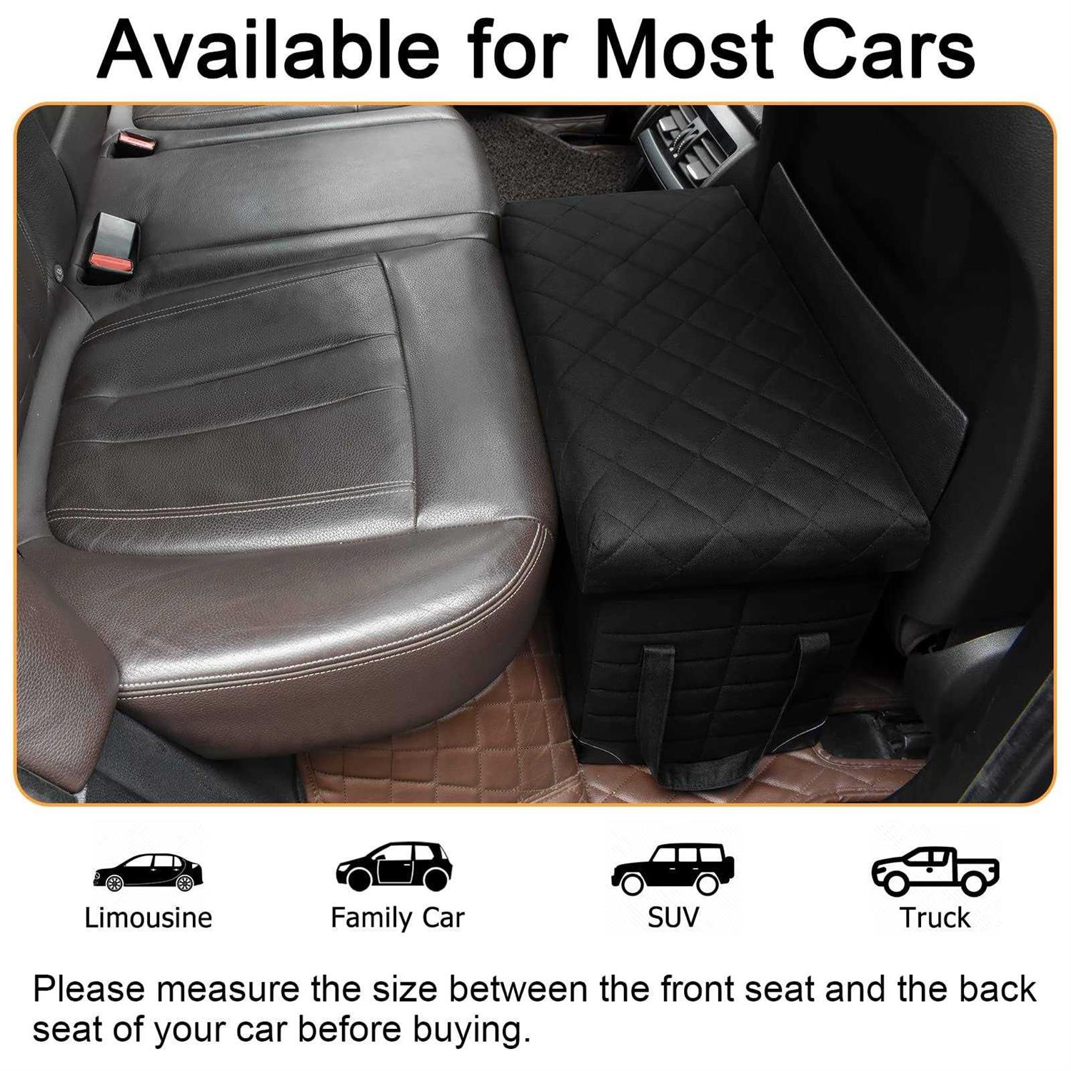 CAR SEAT EXTENSION FOR COMFORT AND SAFETY – It features a comfortable soft top for pets to rest their paws or head. The car seat extender allows your pets to have the entire front or back seat to stretch and be comfortable on long trips. It prevents your dog from falling out of the seat when the car suddenly stops. Extra Storage Space The dog car seat extender has plenty of space for extra stuff, you can store treats, leashes, toys and other pet supplies. And two dividers that fix in place if desired. [Firm and Anti-slip] All sides are designed with firm fiberboard with sponge. The dog back seat extenders and bottom are very firm to ensure that items placed in the extenders prevent rolling or tipping. The bottom is non-slip, effectively ensuring the safety of the pet while driving. FOLDABLE DESIGN & EASY TO CLEAN – It is super easy to assemble (and super easy to fold quickly if needed), complete assembly or disassembly in less than a minute. The dog back seat extender has handles for easy removal, put on or carry. Can be cleaned with a cloth if dirt gets into it. Combined Use You can use a back seat cover that allows your pets to have the whole back seat to stretch and be comfortable on long trips. CHECK THE SIZE The car seat extenders are suitable for most cars, trucks, SUVs. Please measure the size between the front seat and the back seat of your car before buying, in case our back seat extension for dogs does not fit your car.