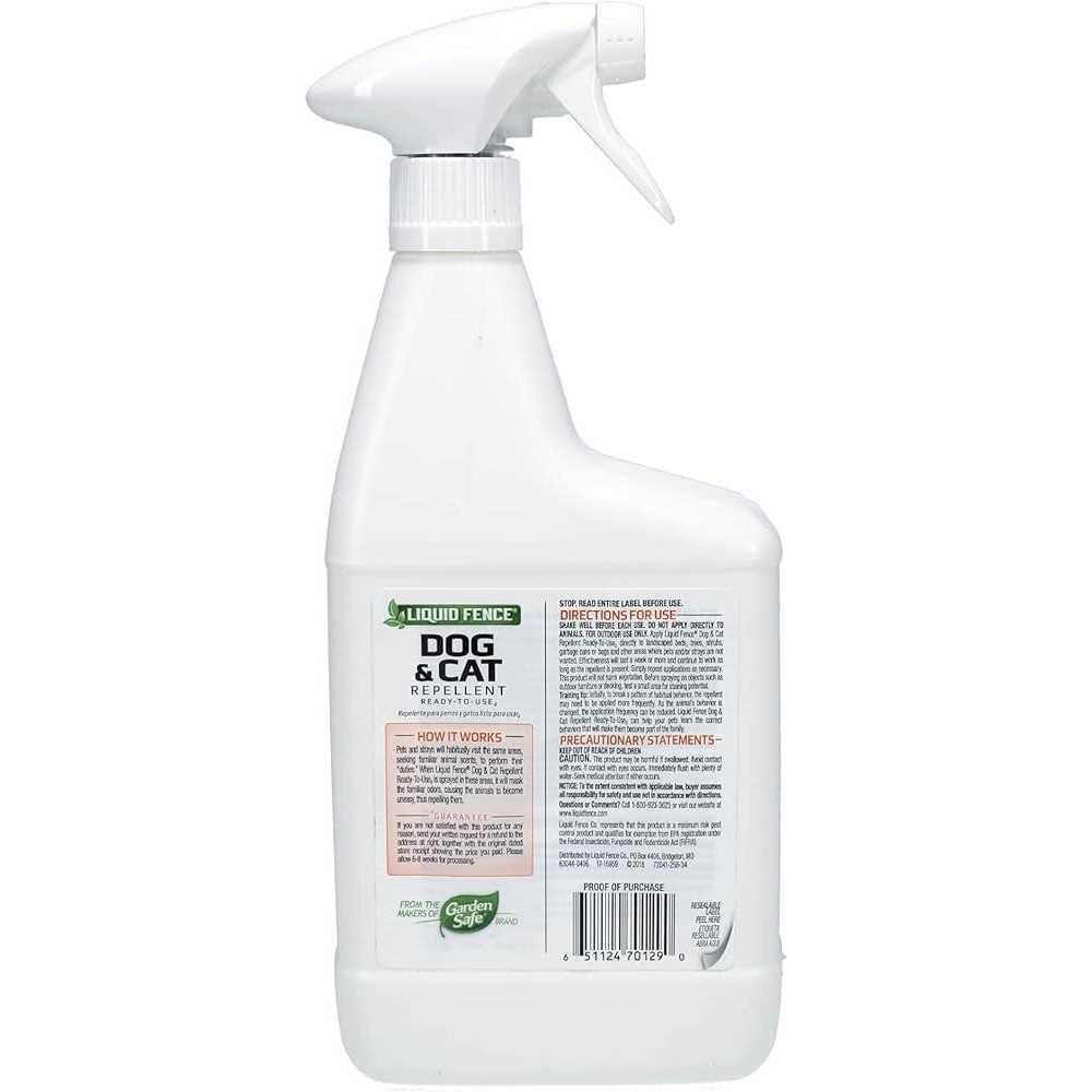 Pets and strays will habitually visit the same areas, seeking familiar animal scents, to perform their duties. When liquid fence dog & cat repellent ready-to-use is sprayed in these areas, it will mask the familiar odors, causing the animals to become uneasy, thus repelling them. Spray on lawns, trees, shrubs, flower beds, garden areas, trash cans and other areas where pets and/or strays are not wanted. Simply repeat applications as necessary. Liquid fence dog & cat repellent ready-to-use is harmless to plants and animals when used and stored as directed and it will not harm vegetation. Effectiveness will last a week or more and continue to work as long as the repellent is present Prevents pets and strays from marking outdoor areas, when used as directed Do not apply directly to animals 32 oz.